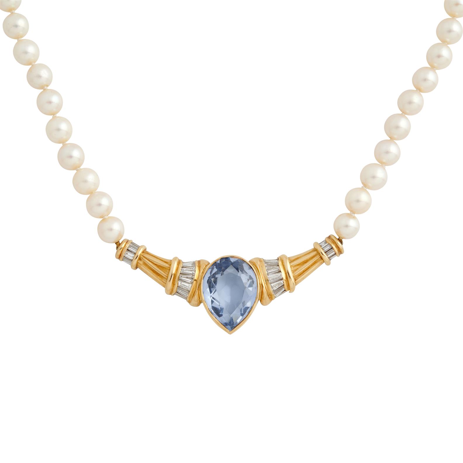 Comprising a strand of cultured pearls, centring a panel with a pear-cut topaz weighing approximately 13.00 carats flanked by reeded panels detailed with baguette-cut diamonds, completed by a magnetic clasp in gold plated silver,