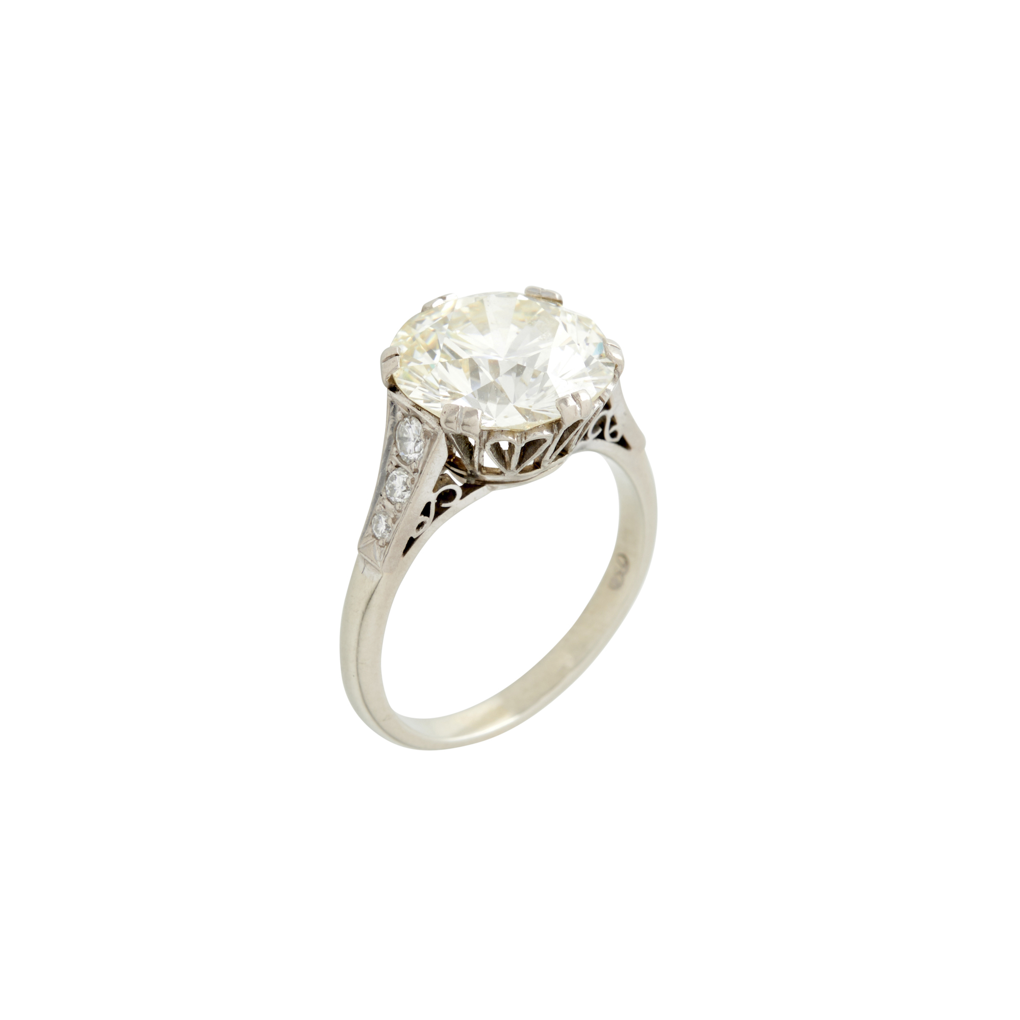 Claw-set with a brilliant-cut diamond weighing approximately 4.25 carats, the shoulders detailed with six grain-set brilliant-cut diamonds together weighing approximately 0.14 carats, size J.