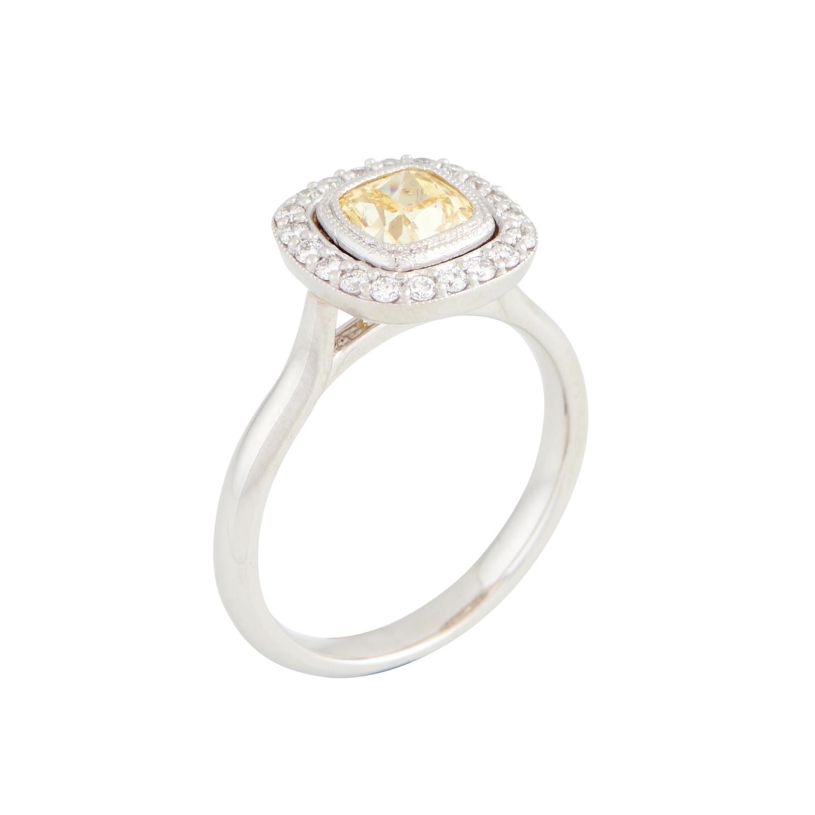 A DIAMOND RING IN 18CT WHITE GOLD, THE YELLOW DIAMOND WEIGHING 1.02CTS (NATURAL FANCY INTENSE, I1) THE COLOURLESS DIAMONDS TOTALLING 0.22CTS, SIZE M, ACCOMPANIED BY GIA REPORT NUMBER 2156455246
