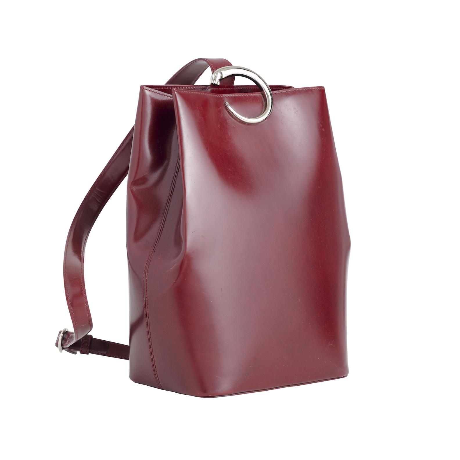 CARTIER, VINTAGE PANTHERE SLINGBACK BAG, STYLED IN SMOOTH DARK RED LEATHER WITH SILVER TONE HARDWARE, FEATURING ADJUSTABLE STRAP AND PANTHERE MOTIF CLOSURE, 30 X 20 X 14CM