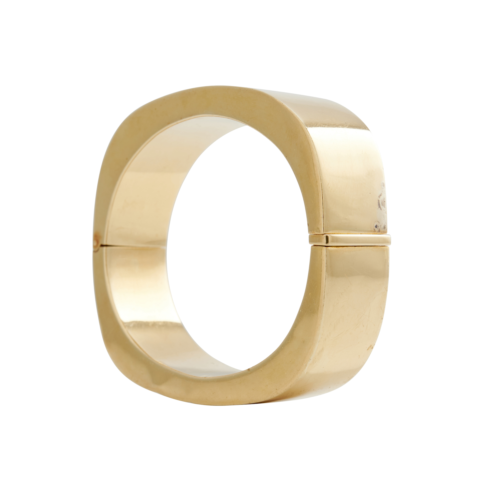 The hinged bangle, completed by a tongue and groove clasp, inner circumference 165mm, gross weight approximately 82.2 grams.