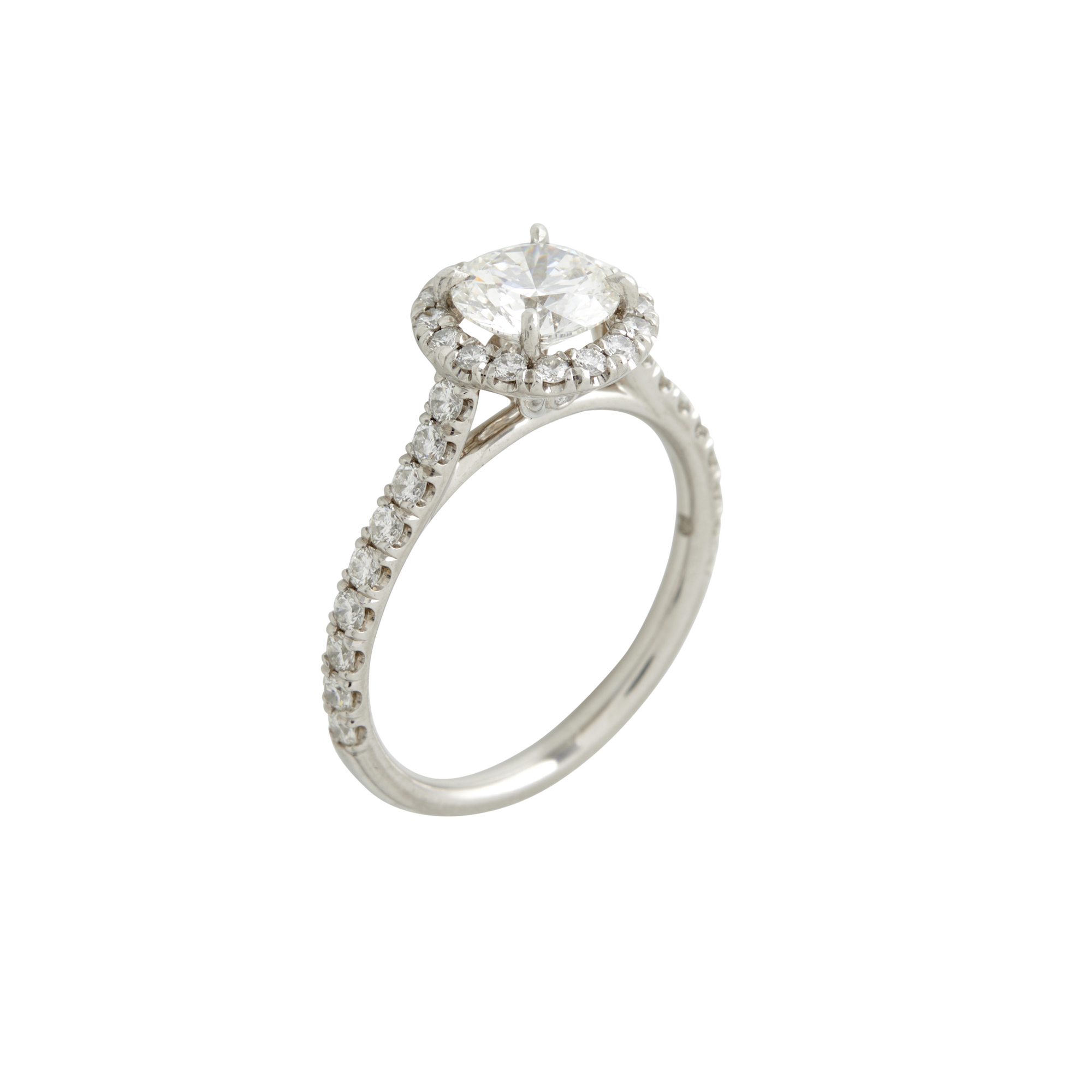 Of cluster design, centring a claw-set brilliant-cut diamond weighing 1.02 carats, within a surround of further diamonds, to diamond set shoulders together weighing approximately 0.36 carats, size M.