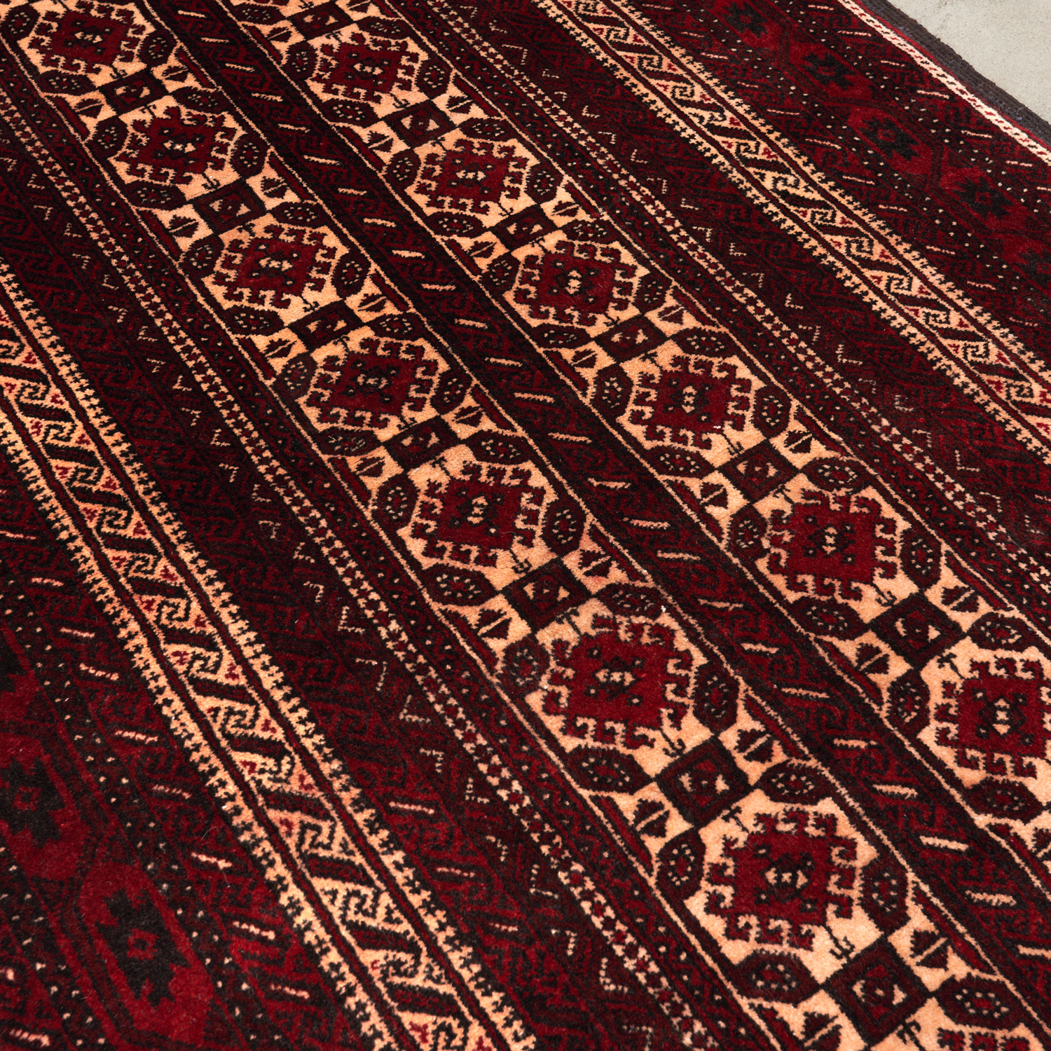 A FINE TRIBAL PERSIAN TURKOMAN TORBAT RUG. 100% SOLID AND DENSE WOOL PILE. IN PRISTINE CONDITION – AS NEW. FINELY HAND-KNOTTED TRIBAL WEAVE WITH TRADITIONAL OF DOUBLE ROW OF GUL MOTIFS. ALL OVER COLOUR TONES OF CHARCOAL, RED, CREAM. TRIPLE WEAVE SELVAGES. SIZE: 193 X 98 CM ORIGIN: PERSIA – RRP: $950 DOCUMENTATION OF AUTHENTICITY INCLUDED