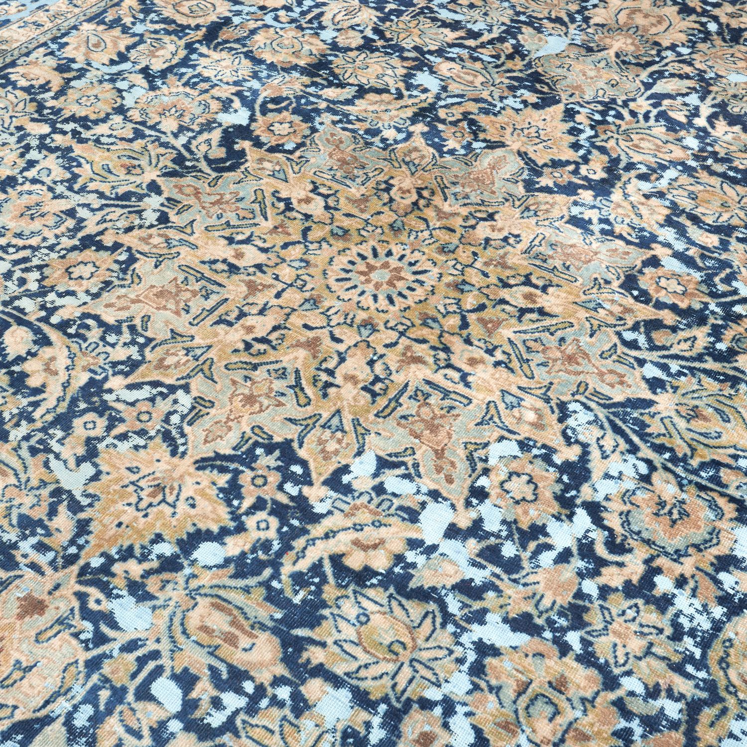 AN EX GALLERY MODERN OVER-DYED VINTAGE PERSIAN KERMAN CARPET. WITH A CENTRAL FLORAL MEDALLION- CREATED FROM A FINELY HAND-KNOTTED DESIGN PERSIAN KERMAN CARPET. THE RUG IS OVER-DYED IN BLUE TONES, TAUPE AND A HINT OF RUST. SIZE: 327 X 267 CM- ORIGIN: PERSIA – RRP: $5,500 DOCUMENTATION OF AUTHENTICITY INCLUDED.