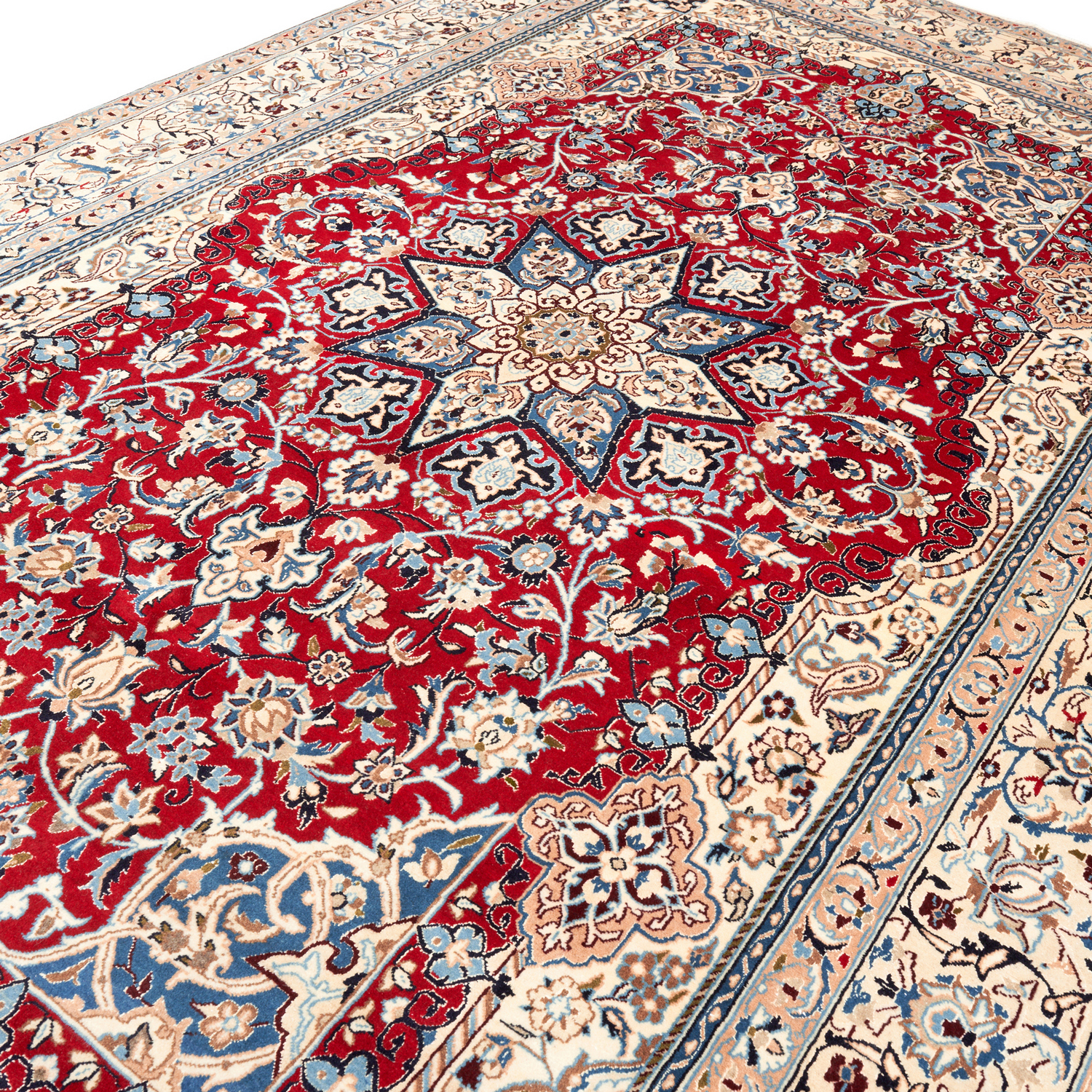 A BEAUTIFUL PERSIAN SILK; WOOL NAIEN CARPET, EX-GALLERY PIECE, FIRST TIME OFFERED. EXTREMELY FINELY HAND-KNOTTED WITH APPROXIMATELY 400,000 INDIVIDUAL KNOTS PER SQUARE METER. COMPRISING OF A CENTRAL STAR ELONGATED MEDALLION SURROUNDED BY FLORAL SPRAYS, PALMETTES AND ESLIMI SCROLLS, JAR MOTIFS WITH FLOWERS ON A POMEGRANATE RED FIELD. ALL OVER TONES OF FRENCH BLUE, CREAM AND RED WITH A HINT OF COGNAC. SIZE: 337 X 205 CM- ORIGIN: IRAN – RRP: $5,900 DOCUMENTATION OF AUTHENTICITY INCLUDED
