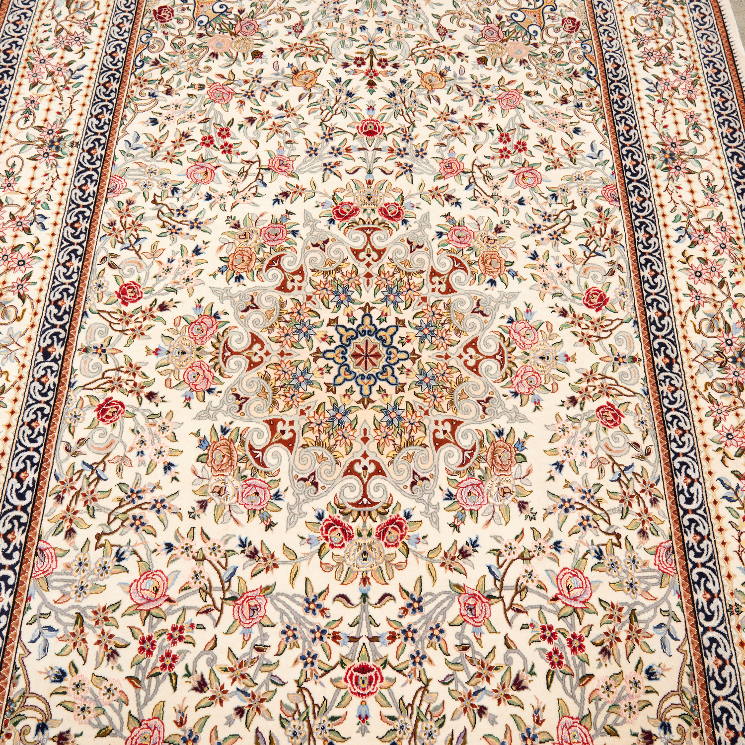 A WORLD CLASS PERSIAN ISFAHAN RUG, 100% FINELY HAND KNOTTED WITH THE FINEST LAMBS WOOL AND SILK INLAYS. APPROXIMATELY 750,000 KNOTS PER SQUARE METRE. STUNNING CENTRAL SUNBURST MEDALLION, IN TONES OF PLATINUM, SAFFRON GOLD AND GREEN ON AN IVORY FIELD OF BUNCHES OF GUL FARANG ROSES, FLORAL SPRAY AND TENDRILS IN PRISTINE CONDITION. SIGNED PIECE "IRAN ISFAHAN ZAMANI MASTER WEAVING STUDIO. SIZE: 230 X 140 CM- ORIGIN: PERSIA - RRP: $17,000 DOCUMENTATION OF AUTHENTICITY INCLUDED.