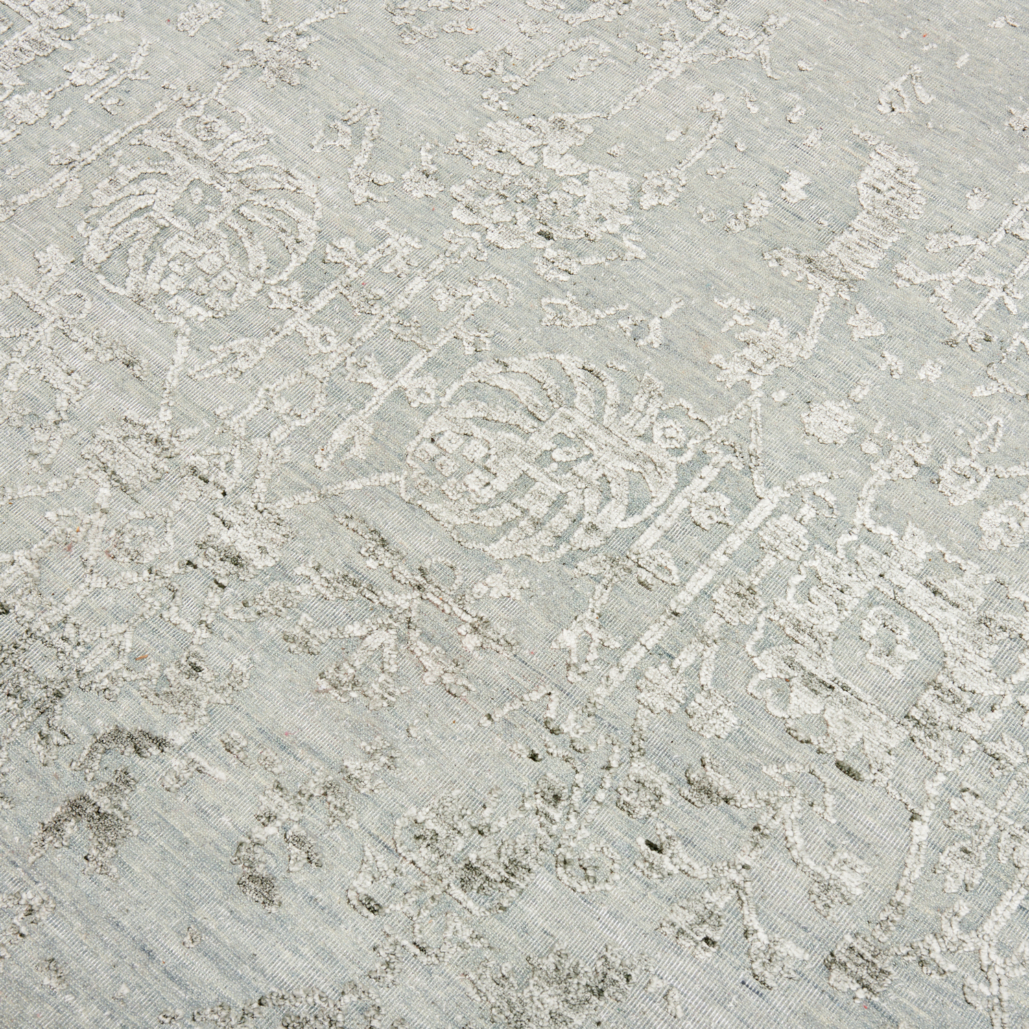 A CONTEMPORARY TRANSITIONAL DESIGNER CARPET, 100% STONEWASH WOOL PILE, HAND LOOMED WITH ERASED TENCEL SILK. IN TONE COLOURS OF DARK GREY, SILVER, AND BLUE. SIZE: 344 X 244 CM-ORIGIN: INDIA: RRP: $3,900 DOCUMENTATION OF AUTHENTICITY INCLUDED.