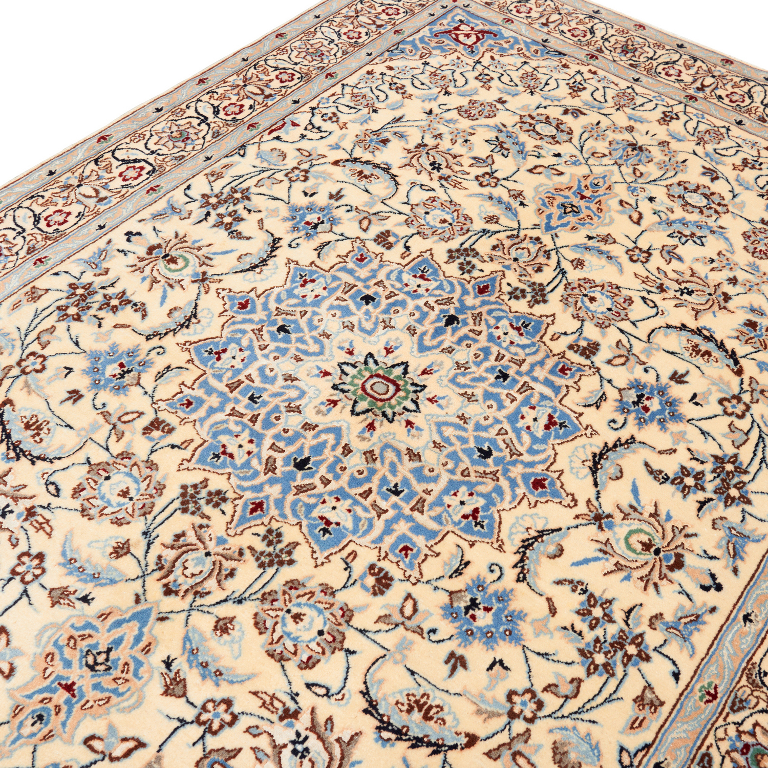 A HAND-KNOTTED PERSIAN NAIEN CARPET FROM THE KHORASAN REGION. 100% FINE LAMB'S WOOL PILE INTER KNOTTED WITH SILK HIGHLIGHTS TO THE OUTER BORDER. CLASSIC NAIEN DESIGN OF CENTRAL SUNBURST MEDALLION AND QUARTERED CORNER MEDALLIONS IN A CREAM FIELD OF PALMETTES, FLORAL SPRAYS AND ARABESQUE SCROLLS. IN TONES OF NAVY, FRENCH BLUE AND IVORY WITH BURGUNDY HIGHLIGHTS. BORDER OF PALMETTES; FLORAL SPRAYS. SIZE: 200 X 130 CM ORIGIN: PERSIA - RRP: $2,900 DOCUMENTATION OF AUTHENTICITY INCLUDED.