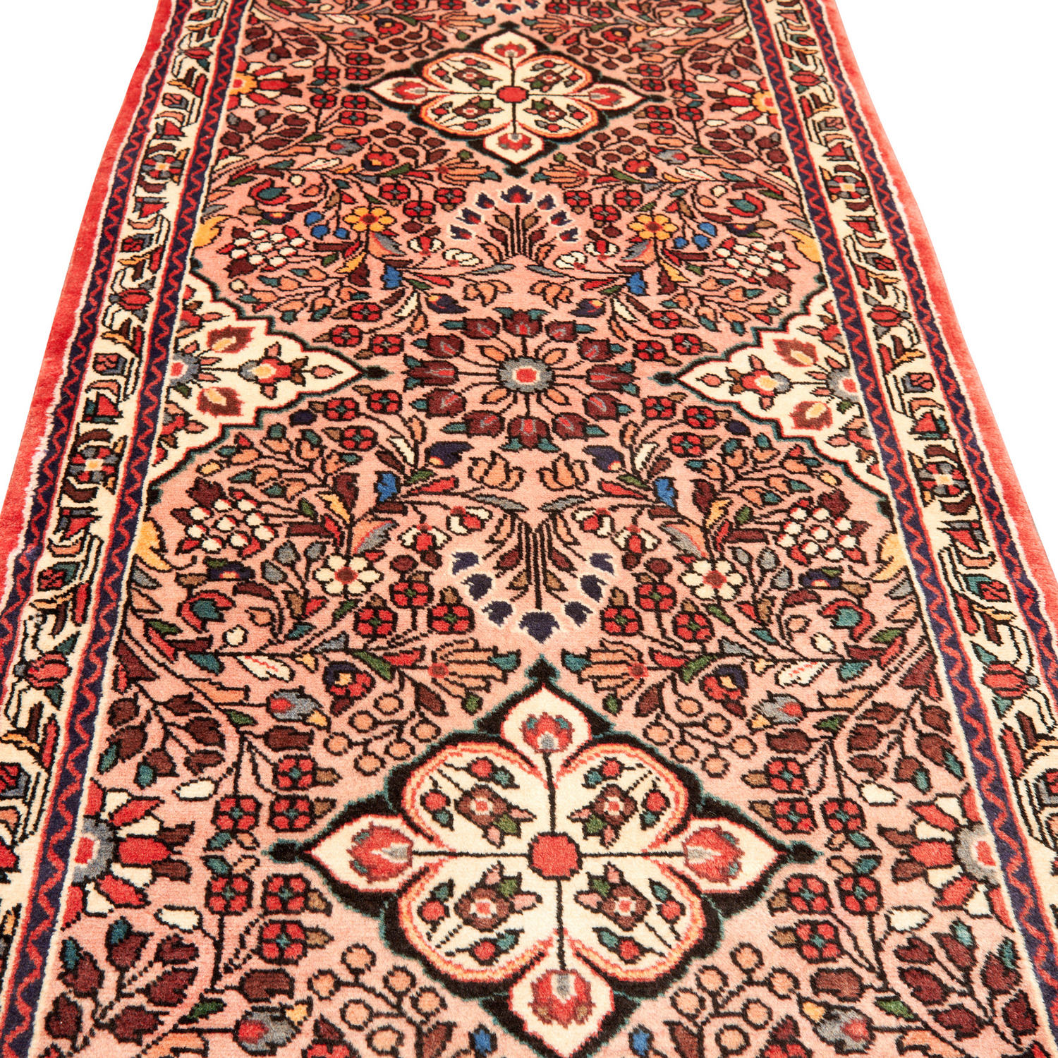 AN EXTRA LONG PERSIAN MEHRABAN HALL RUNNER, 100% FINE WOOL, NATURAL DYES. HAND-KNOTTED VILLAGE WEAVE WITH A TRADITIONAL DESIGN OF CONTINUING CENTRAL DIAMOND FLORAL MEDALLIONS ON AN ALL-OVER FIELD OF FLORAL SPRAYS. BORDER OF MINI ROSETTES. SIZE: 490 X 82 CM ORIGIN: PERSIA – RRP: $3,400 DOCUMENTATION OF AUTHENTICITY INCLUDED