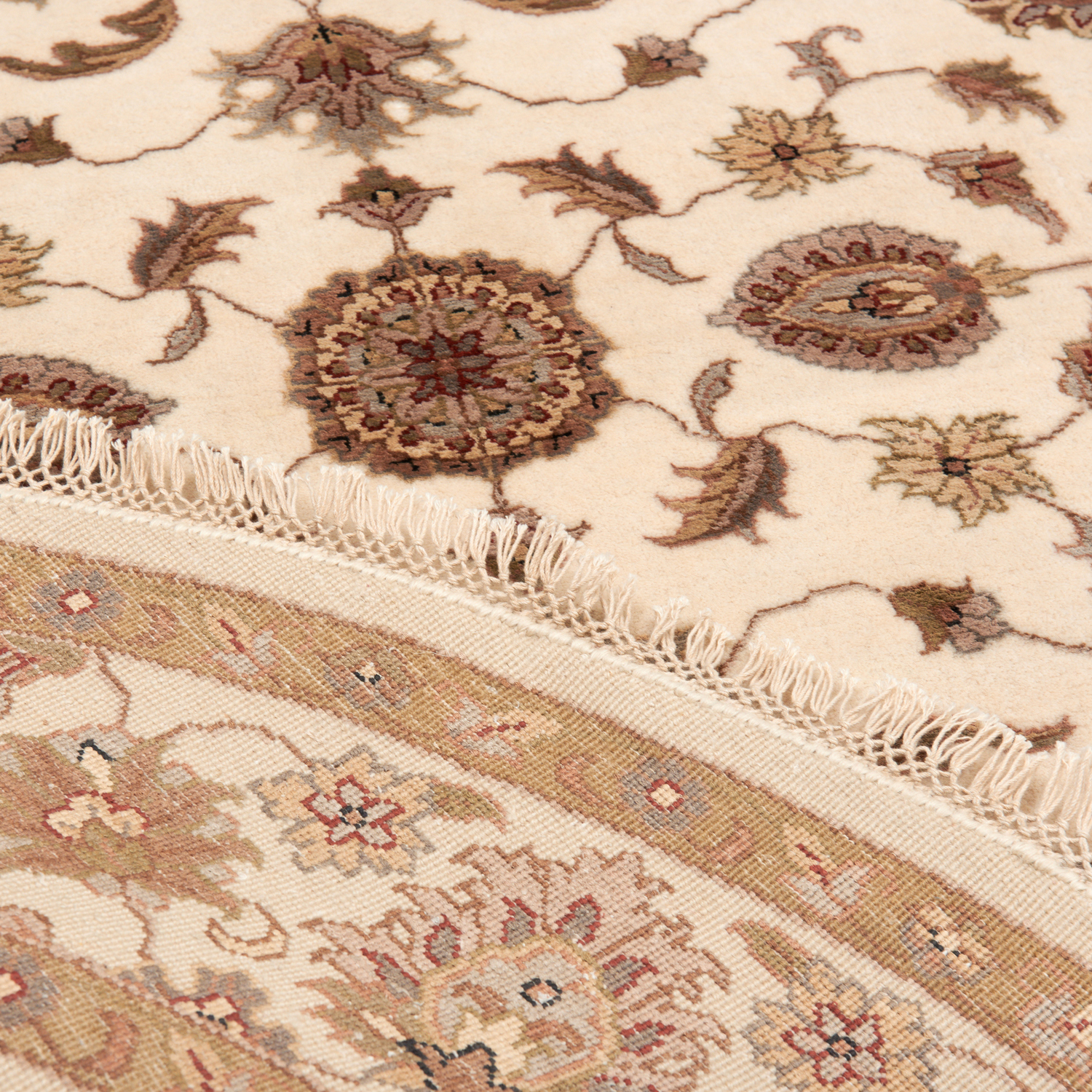 A NEW TABRIZ DESIGN ROUND RUG. EMBOSSED HANDLOOMED SOLID 100%WOOL; BAMBOO SILK TEXTURE. IN TONES OF IVORY, TAUPE AND CHAMPAGNE WITH ROSE HIGHLIGHTS. ORIGIN: INDIA - RRP: $2,100- SIZE: 176 X 176 CM DOCUMENTATION OF AUTHENTICITY INCLUDED.