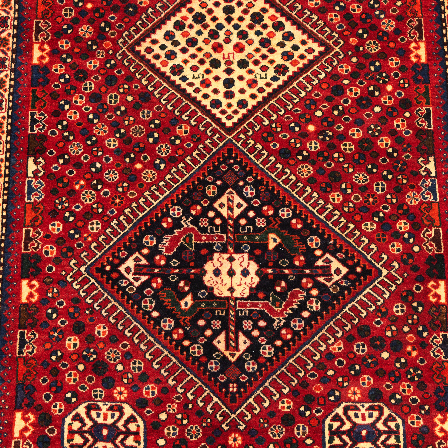 A PERSIAN YALLAMEH DESIGN RUG, QASHQAIE WEAVE. 100% PLUSH WOOL PILE. NATURAL DYES. FINELY HAND-KNOTTED TRIBAL WEAVE WITH TRADITIONAL DESIGN OF CONTINUING DIAMOND HOOKED MEDALLIONS CONTAINING TRIBAL MOTIFS ON A RED FIELD CONTAINING TRIBAL MOTIFS. CORNER MEDALLIONS OF AMULETS. BORDER OF STAR; GEOMETRIC MOTIFS. SIZE: 305 X 164 CM – RRP: $2,900 DOCUMENTATION OF AUTHENTICITY INCLUDED.