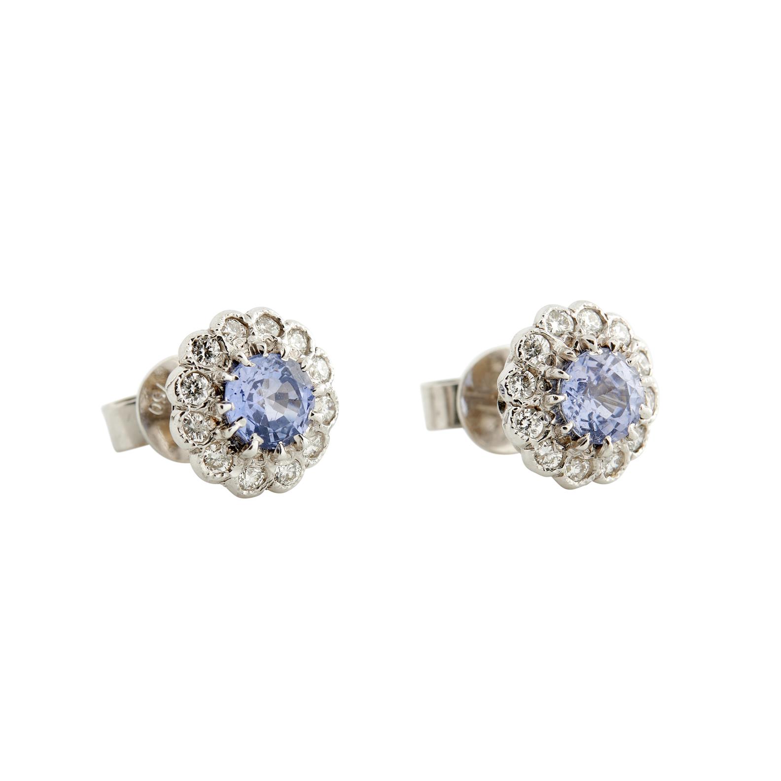 Each earring of cluster design, centring a claw-set circular-cut sapphire within a surround of brilliant-cut diamonds, the sapphires together weighing approximately 1.01 carats, the diamonds together weighing approximately 0.35 carats, to post and butterfly fittings, diameter 9mm.