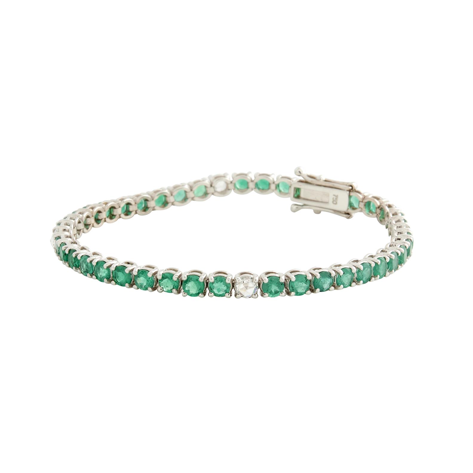Modelled as a continuous line of claw-set circular-cut emeralds, spaced at intervals with claw-set rose-cut diamonds, the emeralds together weighing approximately 6.00 carats, the diamonds together weighing approximately 0.64 carats, completed by a tongue and groove clasp, length 180mm.