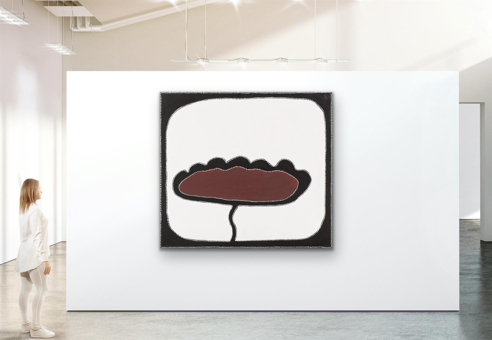 This painting shows a big cave - nawanji - in limestone country near the place called Gawarren in the Bungle-Bungles. This place used to be an important camping area for Gija people before the European invasion. People used to take shelter there in the wet season. There are lots of hand stencils and other paintings in the cave.