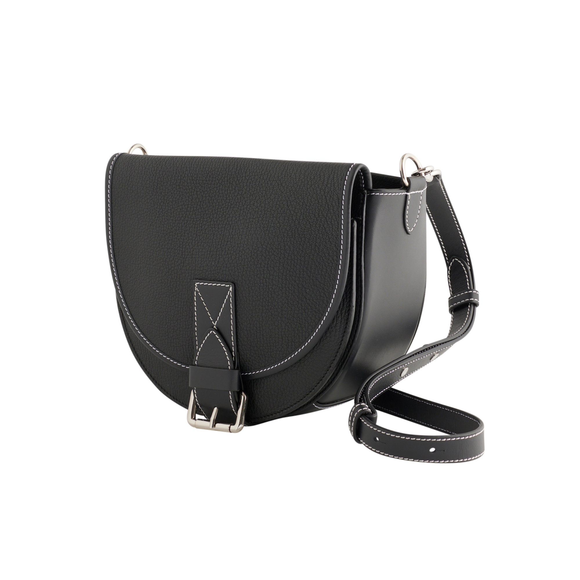 Styled in black grained leather with white top stitch detail and silver tone hardware, 20 x 22 x 11cm.