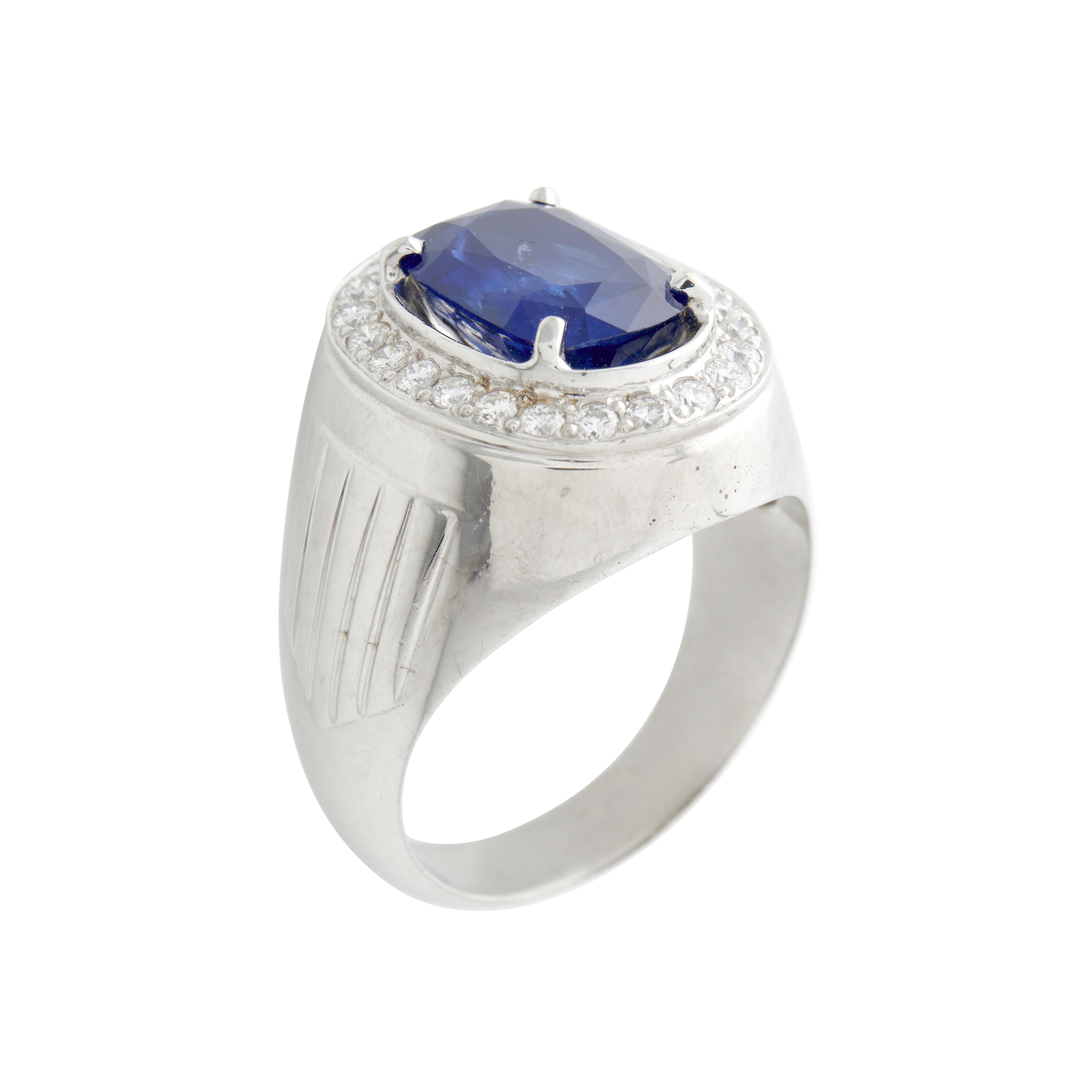 Of cluster design, centring a claw-set oval-cut sapphire within a surround of claw-set brilliant-cut diamonds, the sapphire weighing approximately 5.50 carats, the diamonds together weighing approximately 0.48 carats, size X, gross weight 15.4 grams.