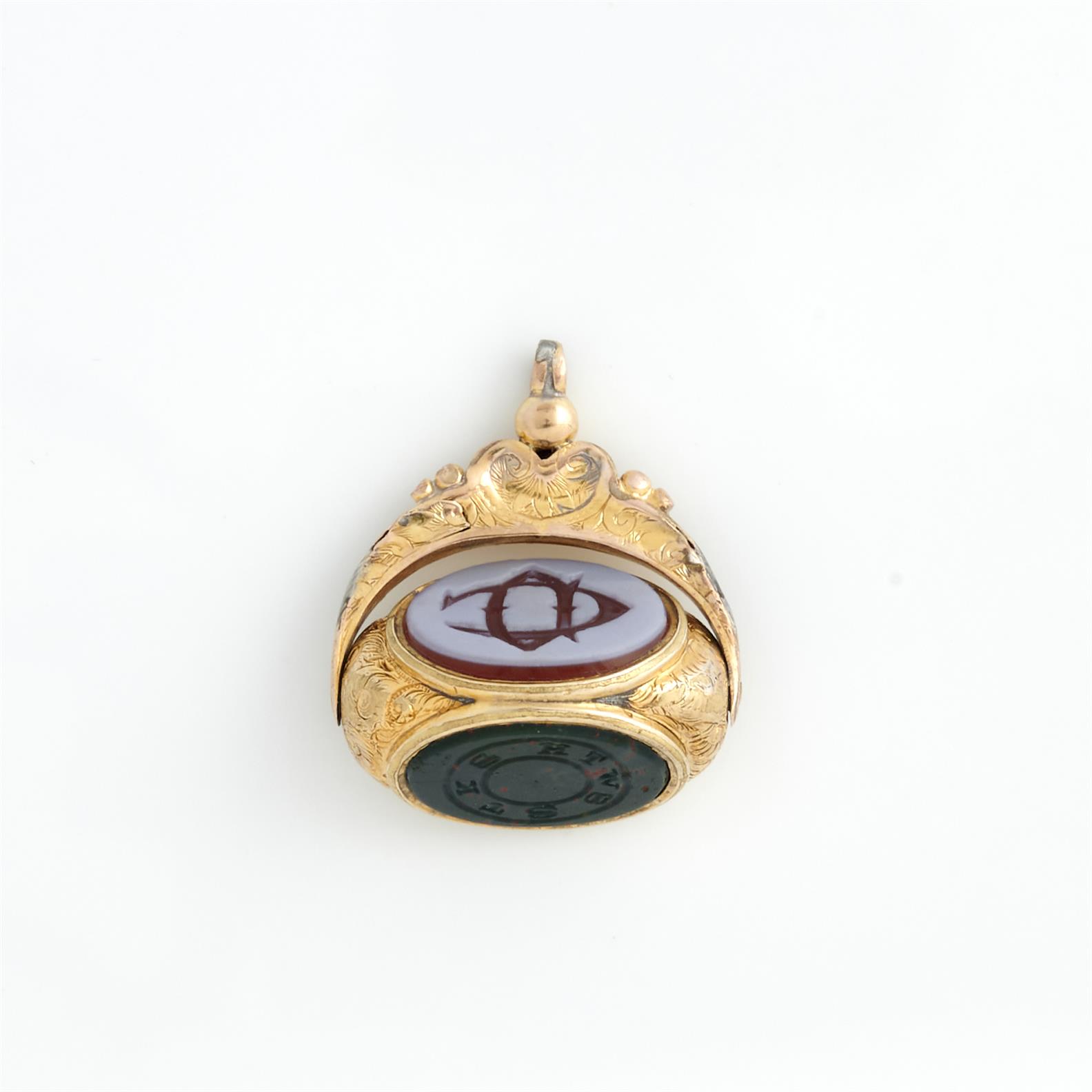 AN ANTIQUE MASONIC HARDSTONE SPINNER SEAL IN 9CT GOLD AND GOLD PLATE, 25MM X 23MM, 8.6GMS