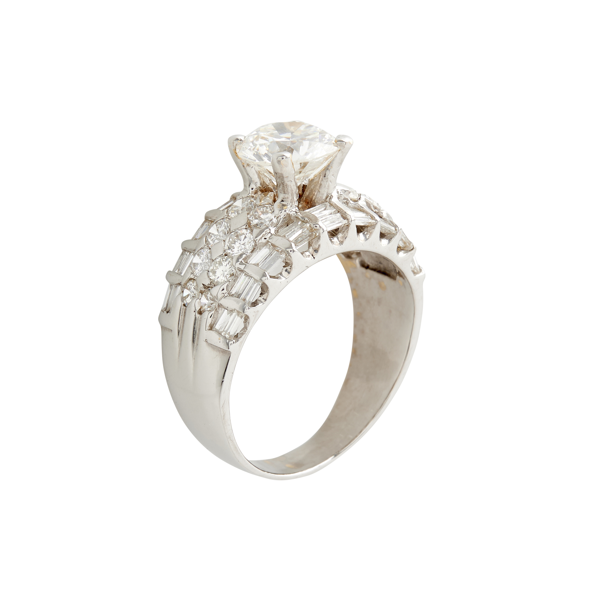 Centring a claw-set brilliant-cut diamond weighing 1.25 carats, on a wide band set with brilliant and baguette-cut diamonds together weighing approximately 1.70 carats, size L.