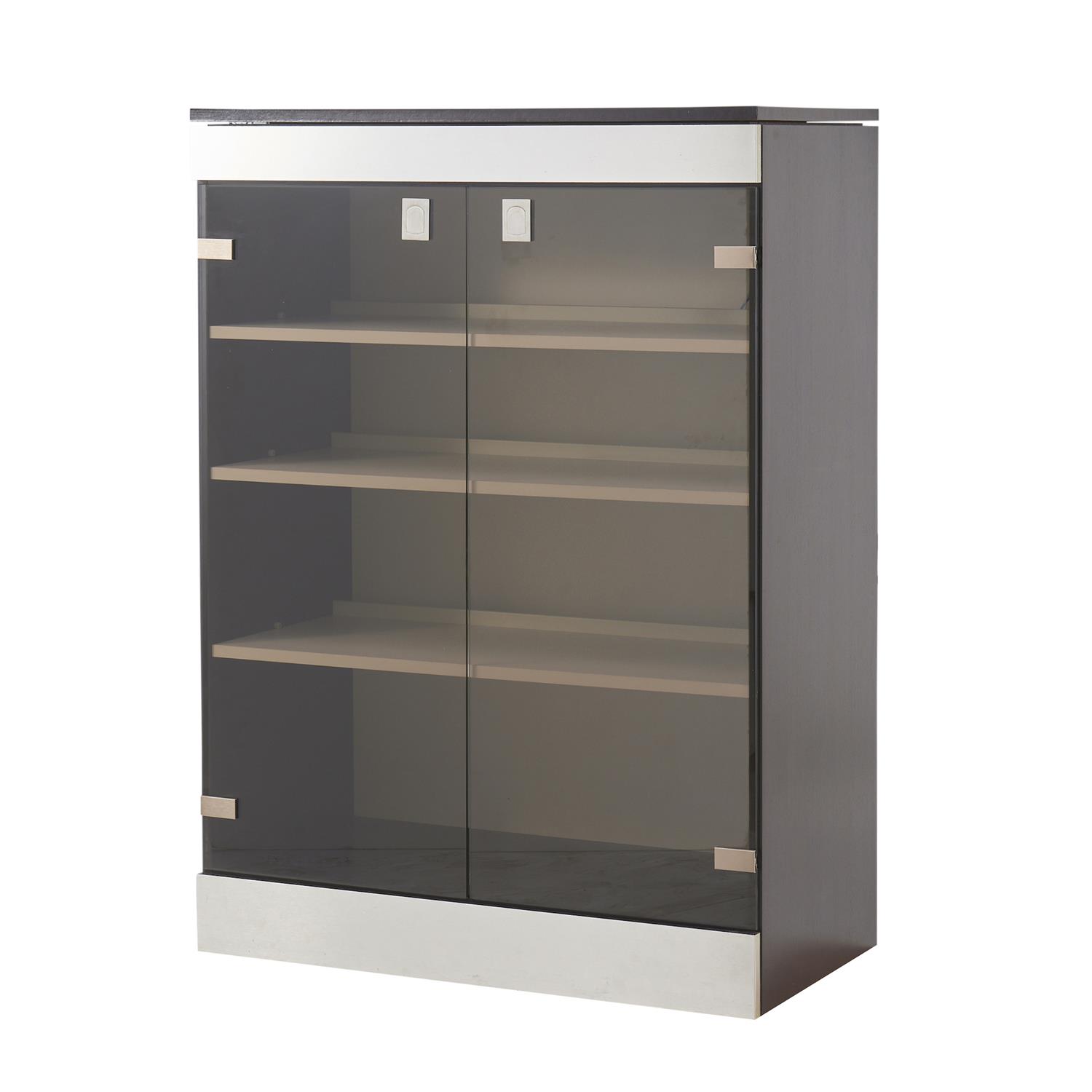 Brushed aluminium, smoke glass and dark stained timber veneer. Two doors and adjustable internal shelves.