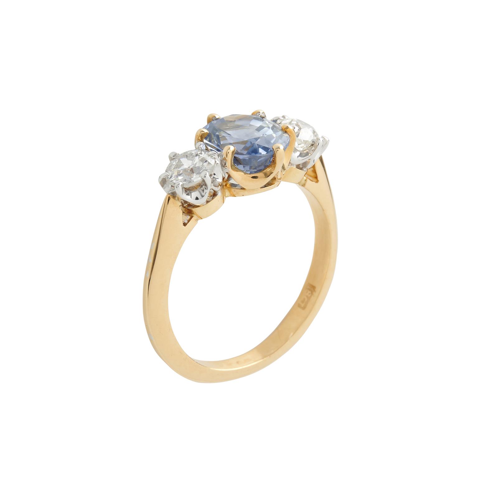 A SAPPHIRE AND DIAMOND RING IN 18CT TWO TONE GOLD, THE SAPPHIRE WEIGHING APPROXIMATELY 2.50CTS, WITH DIAMONDS TOTALLING 0.73CTS, SIZE P