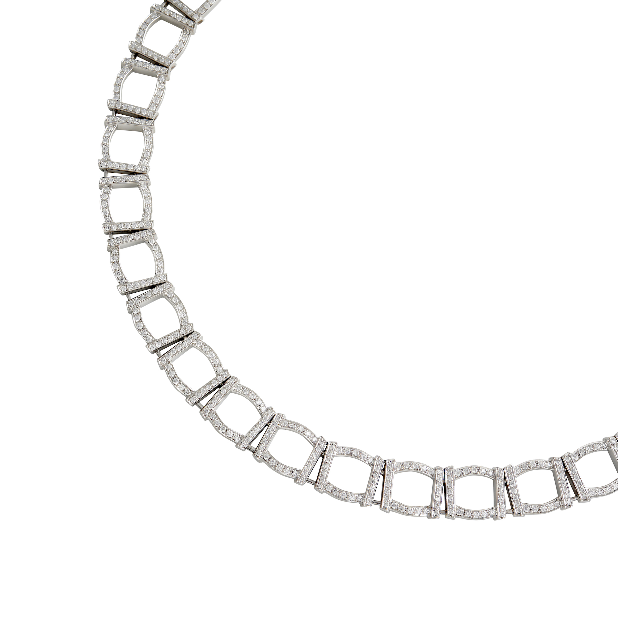 Modelled as a continuous line of open geometric links, set throughout with brilliant-cut diamonds together weighing 6.67 carats, completed by a tongue and groove clasp, signed, length 430mm.