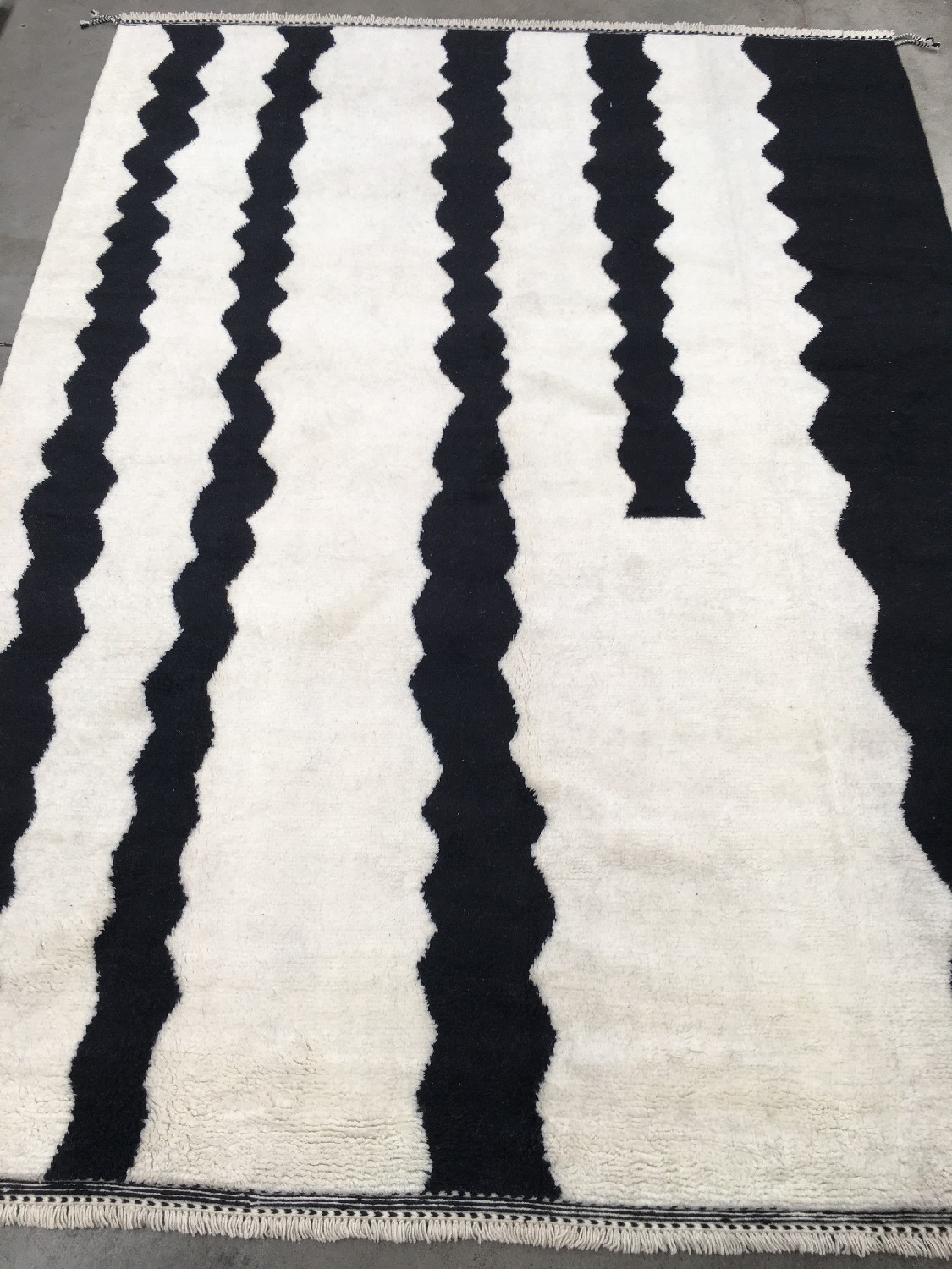 A LARGE NEW PRISTINE MODERN MARRAKESH COLLECTION RUG, 100% WOOL -WARP-WEFT PILE, HAND KNOTTED. DECORATIVE- FASHIONABLE SOFT PLUSH PILE. FINISHED WITH A SUMAC KILIM FRINGE. IN TONES OF BLACK AND WHITE. CONDITION: NEW AND PRISTINE SIZE: 275 X 380 CM-ORIGIN: INDIA – RRP: $5,900 DOCUMENTATION OF AUTHENTICITY INCLUDED.