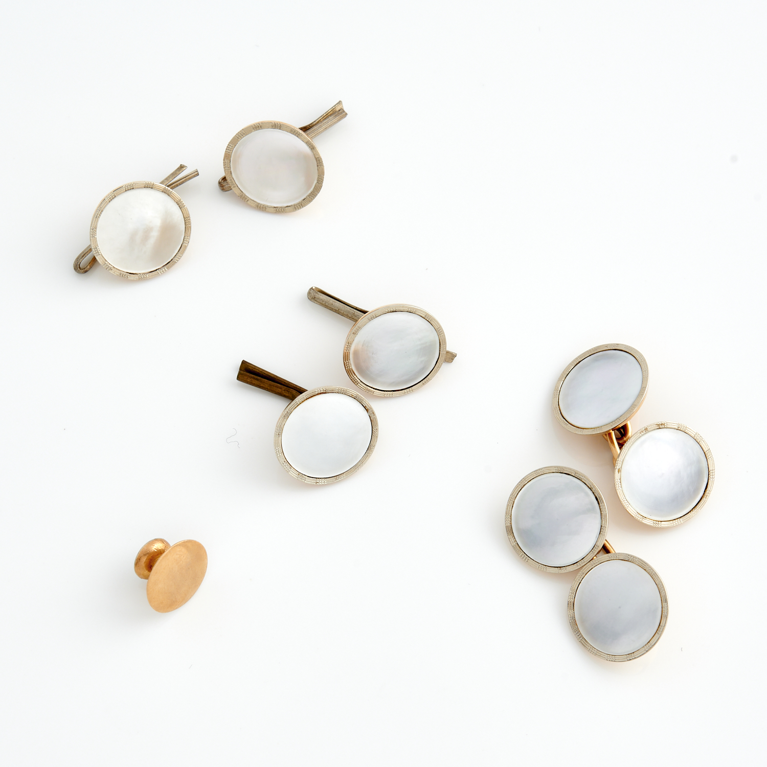 A COLLECTION OF MOTHER OF PEARL CUFFLINKS AND SHIRT STUDS IN 18CT AND 15CT GOLD, 17.4GMS