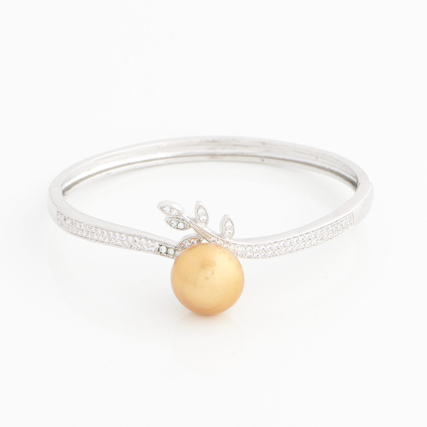 A GOLDEN PEARL AND CUBIC ZIRCONIA SET BANGLE IN SILVER, 65MM DIAMETER