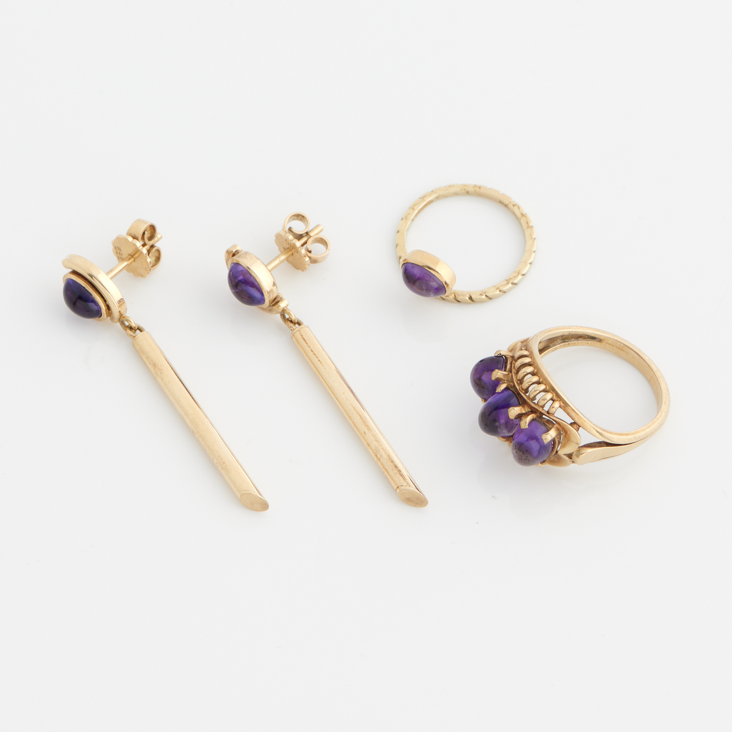 A COLLECTION OF AMETHYST SET JEWELLERY IN 14CT AND 18CT GOLD, INCLUDING A PAIR OF DROP EARRINGS TO POST AND BUTTERFLY FITTINGS, A THREE STONE RING, SIZE N 1/2 AND A SINGLE STONE RING, SIZE K, TOTAL WEIGHT 14.8GMS