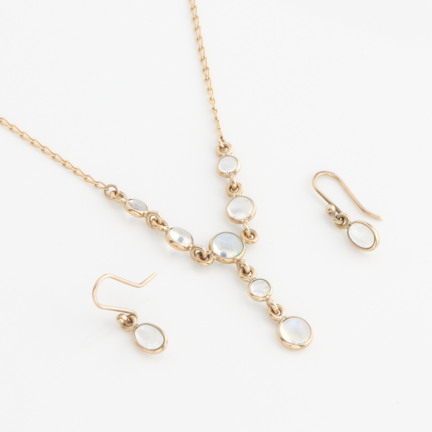 A MOONSTONE SUITE IN 9CT GOLD COMPRISING OF A NECKLACE TO A PARROT CLASP, 440MM, AND A PAIR OF EARRINGS TO SHEPHERD HOOK FITTINGS, TOTAL WEIGHT 5.0GMS
