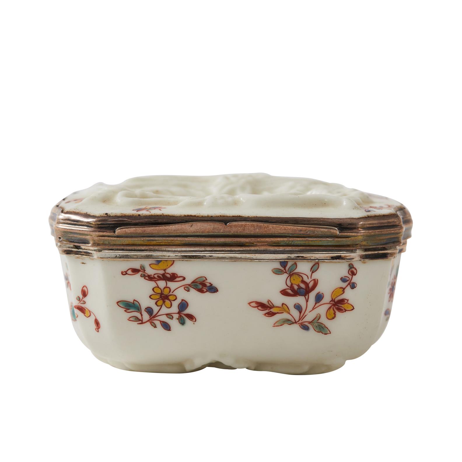 1745-50, of rectangular outline, the cover and base moulded with a rococo cartouche and painted with sprays of flowers.