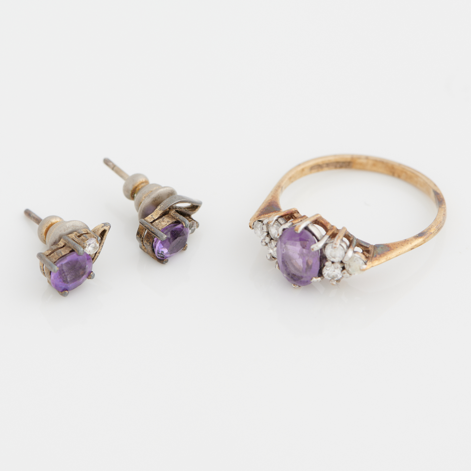 AN AMETHYST AND GEM-SET RING IN 9CT GOLD, BIRMINGHAM HALLMARKS, TOGETHER WITH A PAIR OF EARRINGS IN BASE METAL, TO POST AND BUTTERFLY FITTINGS, RING SIZE N