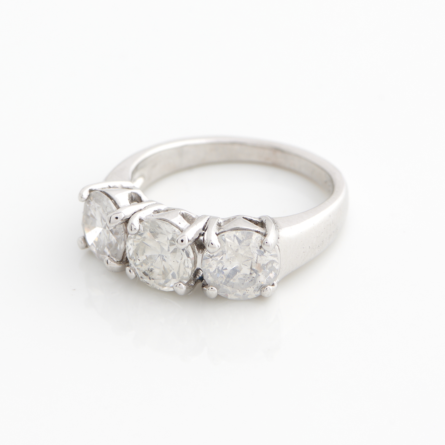 A THREE STONES DIAMOND RING IN 18CT GOLD, THE DIAMONDS TOTALLING 3.02CT, F-G, P1, WITH A VALUATION