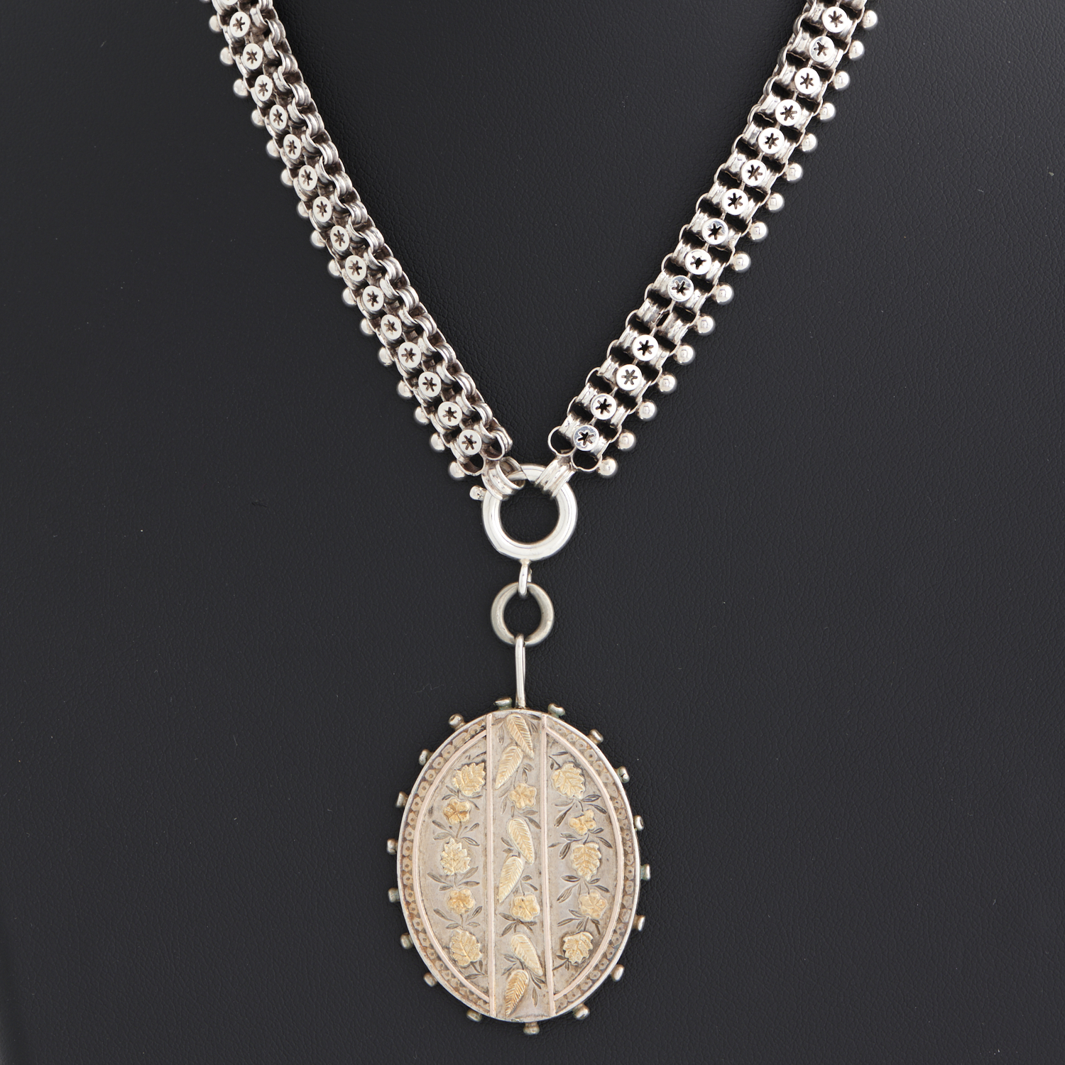 AN ANTIQUE COLLAR IN SILVER TO A PENDANT IN SILVER WITH GOLD DETAIL, CIRCA 1890, 430MM, 30.0GMS