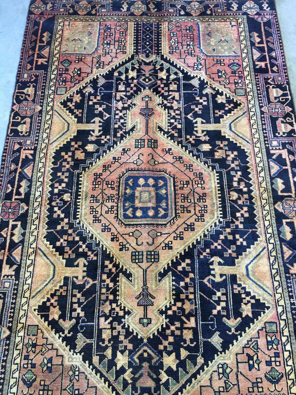 CIRCA 1970'S TRIBAL PERSIAN TOYSERKAN RUG, 100% WOOL; NATURAL DYES, VINTAGE PILE. HAND- KNOTTED VILLAGE WEAVE WITH TRIBAL DESIGN OF HEXAGONAL ANCHORED MEDALLION ; CORNER MEDALLIONS ON A MUTI-TONED FIELD OF GEOMETRIC PATTERNS ; LEAF FORMS. BORDER OF ROSETTES ; TRIBAL MOTIFS. SIZE: 223 X 132 CM CONDITION: PROFESSIONAL MINOR RESTORATION ACCEPTABLE WITH AGE. ORIGIN: PERSIA - RRP: $1,400 DOCUMENTATION OF AUTHENTICITY INCLUDED