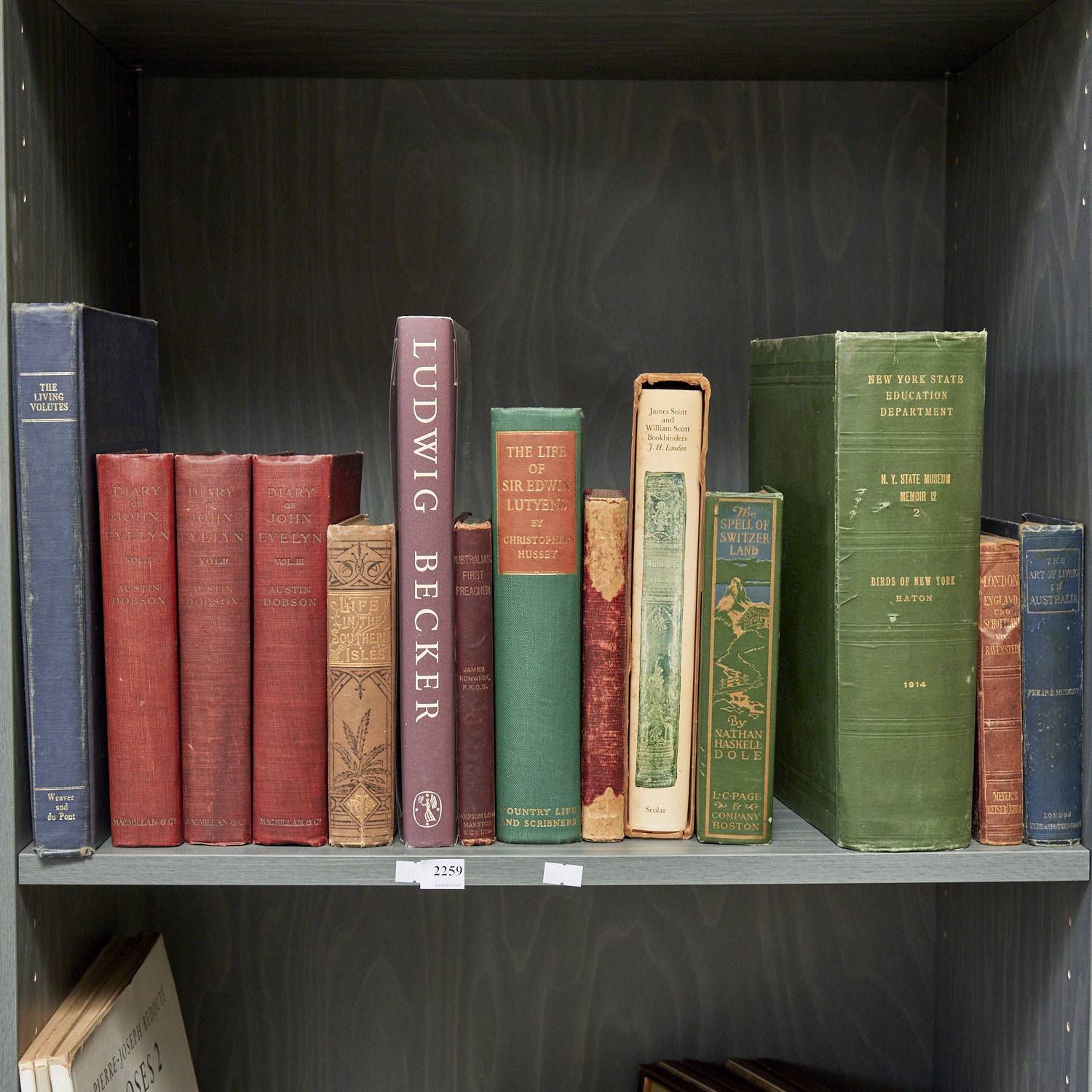 A SHELF OF MISCELLANEOUS BOOKS INCLUDING LUDWIG BECKER, THE LIFE OF SIR EDWIN LUTYENS, AND THE LIVING VOLUTES, LEONARD JOEL DELIVERY SIZE: LARGE