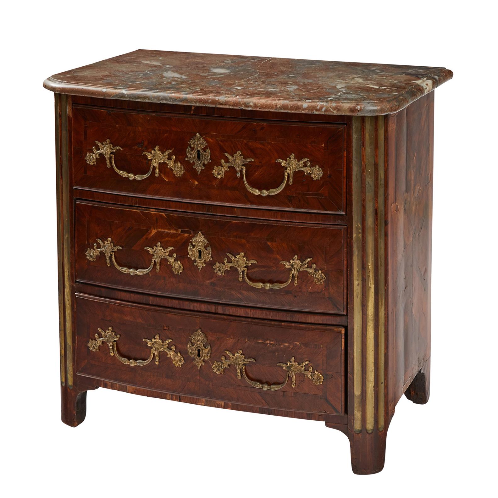 The shaped rouge de rance marble top with moulded edge above three drawers with herringbone veneers, flanked by brass fluted uprights.