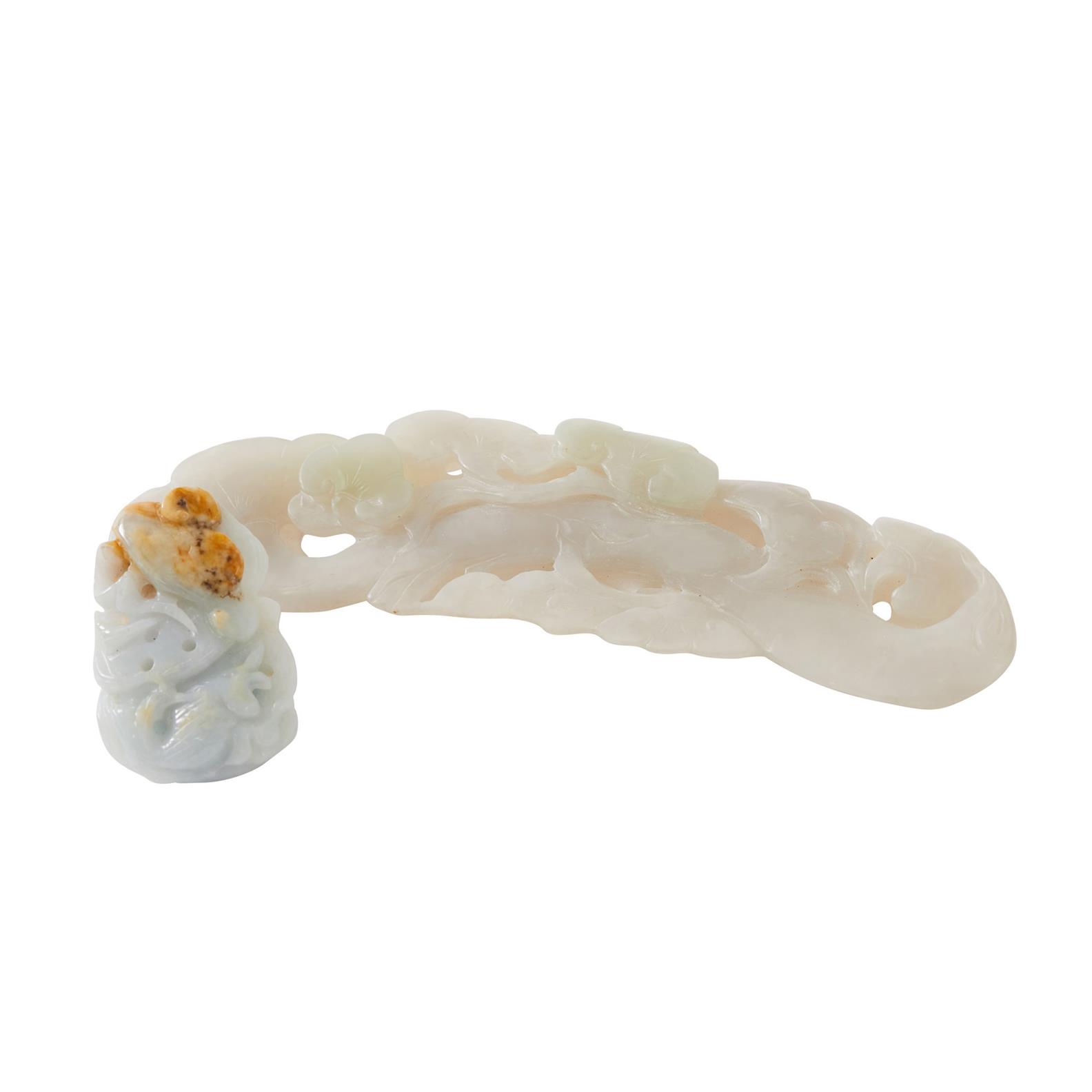 A white/green carving of a ruyi fungus, and pale lavender and brown carving of a dragon and a bat.