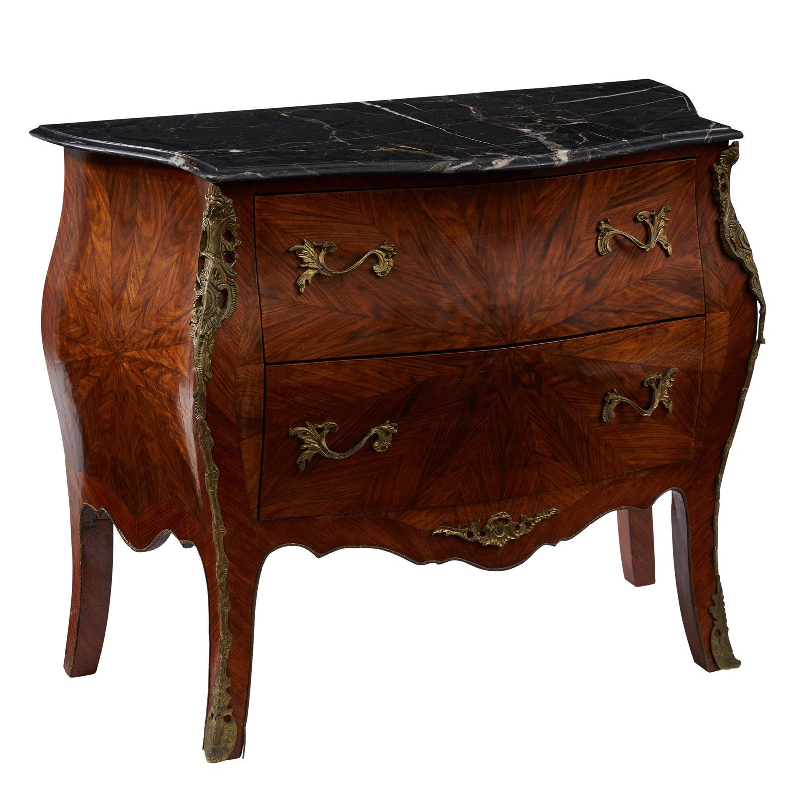 In the Louis XV style, the shaped black marble top above two drawers inlaid 'sans traverse' with radial veneers, having brass chutes, handles and sabots.