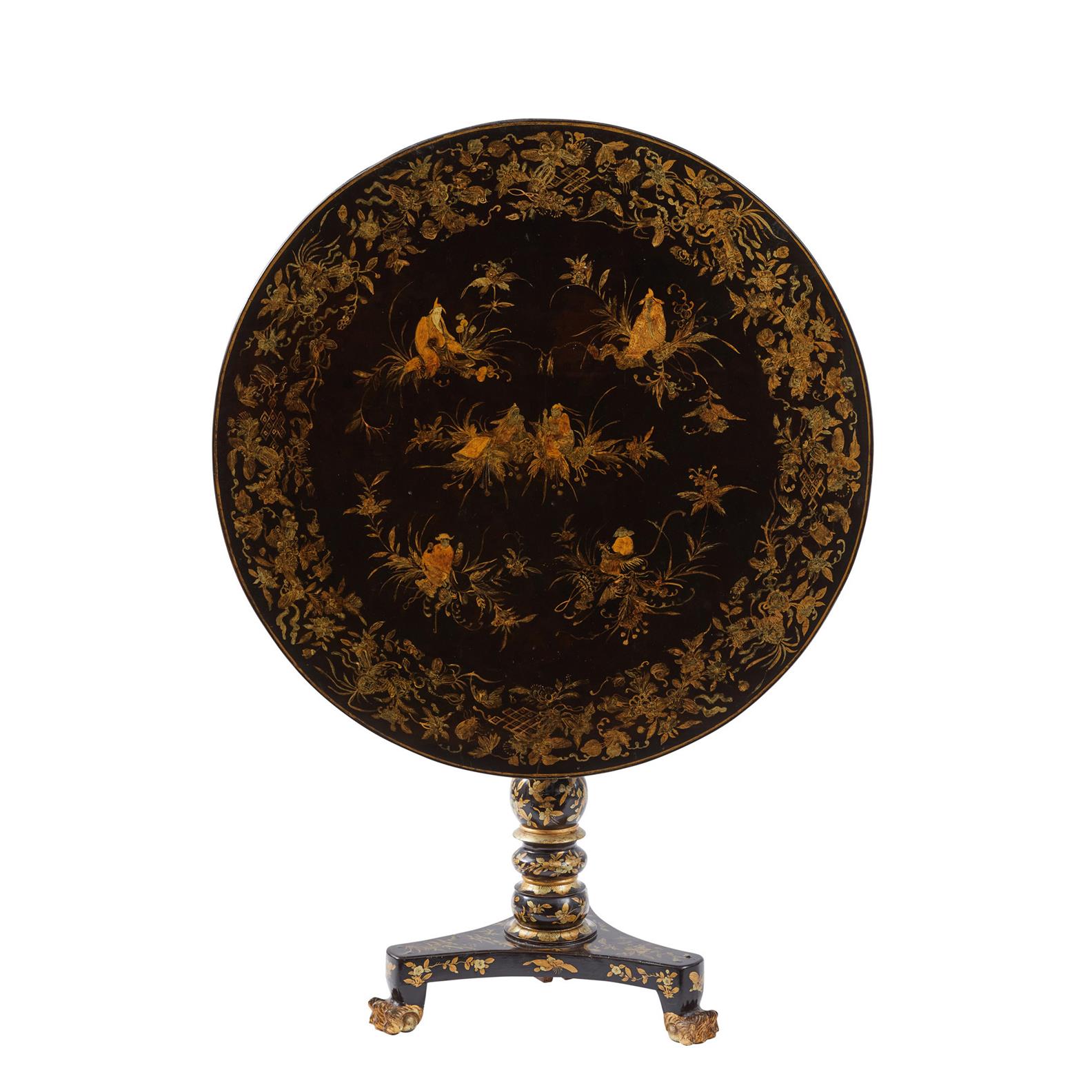 Early 19th century, the circular tilt-top on birdcase base and baluster support pedestal, on triform base with carved paw feet, decorated all-over in gold with flowers, butterflies, insects, mythical creatures and birds.