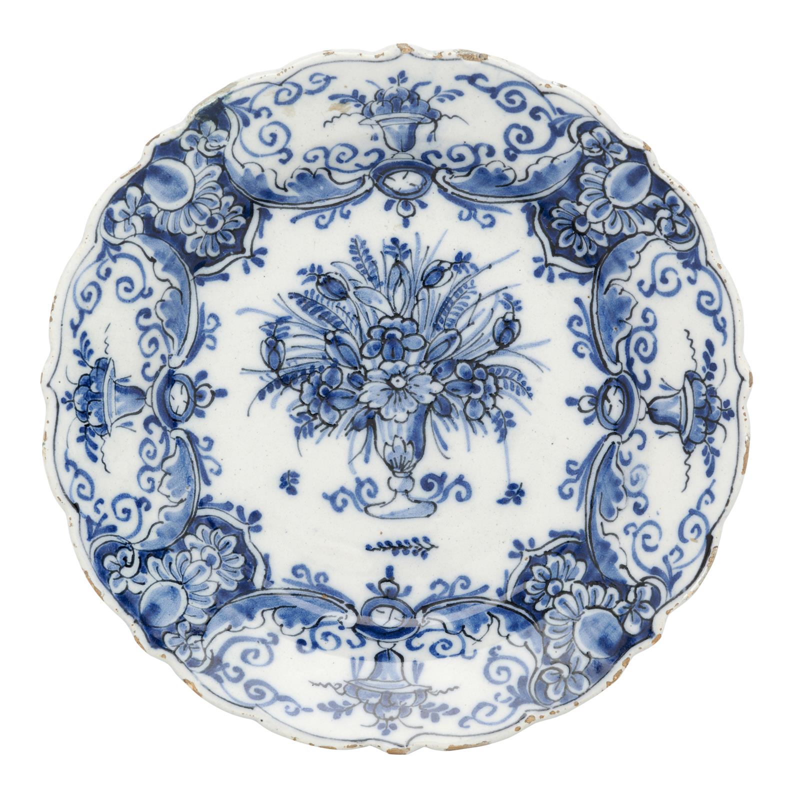 The De Klanis lotus edge plate painted in-glaze in blue with central of flowers and grasses, surrounded by four similar panels in shaped reserves separated by lambrequins, circa 1725