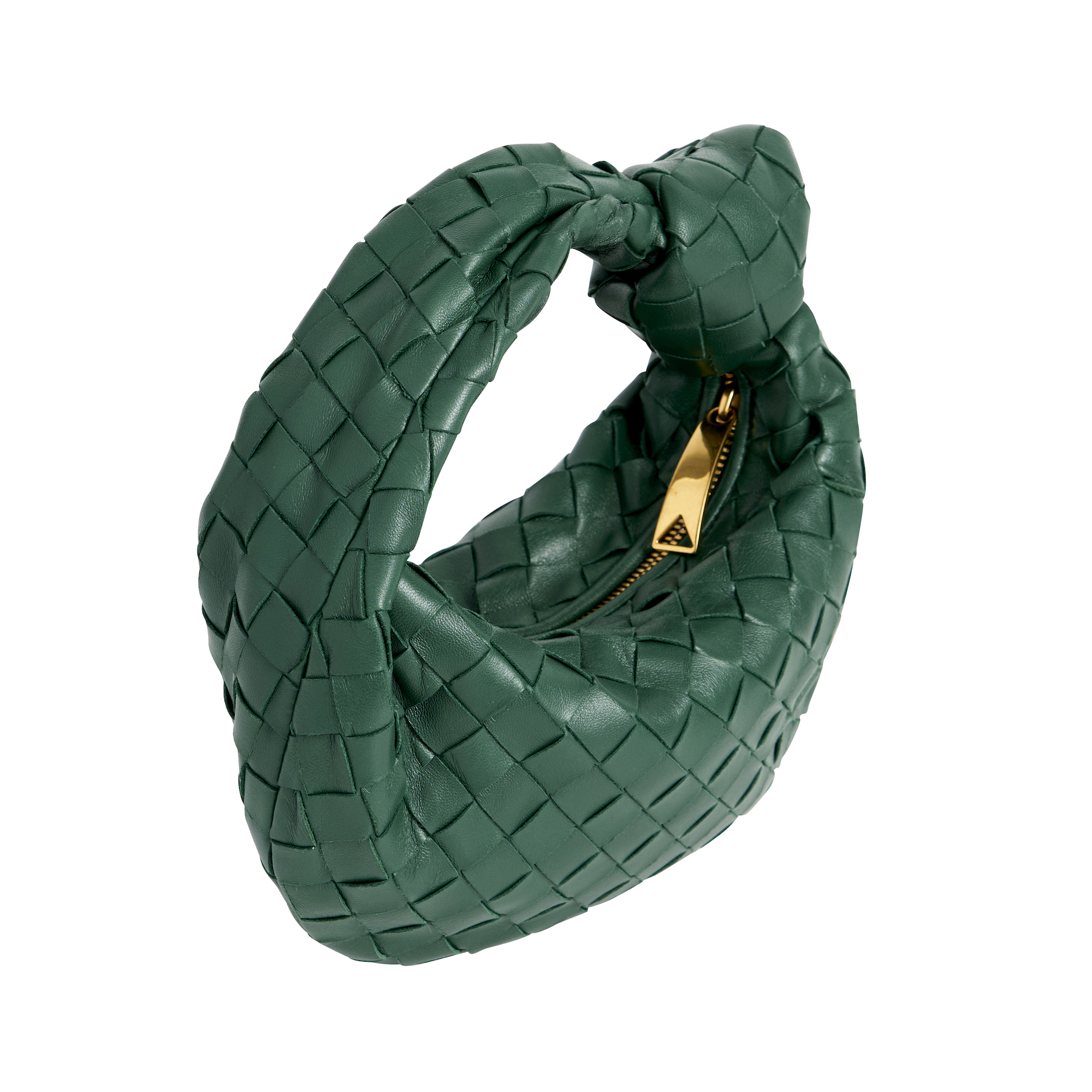 Styled in Raintree green Intrecciato weave Nappa leather with gold tone hardware and knotted handle detail, 14 x 23 x 4cm.