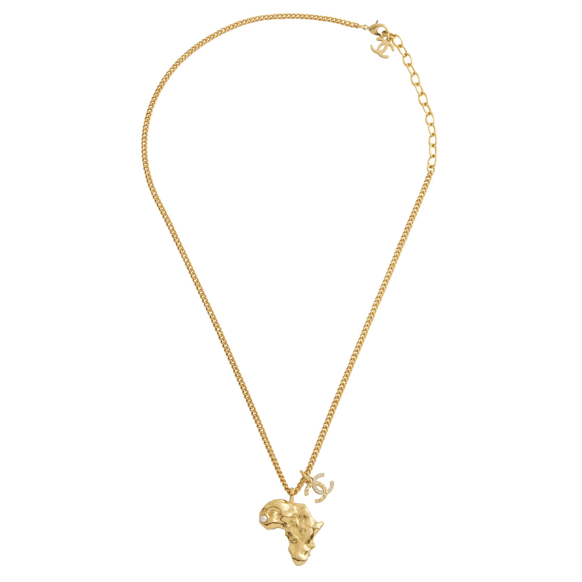 The central pendant styled in the shape of Africa, accented with faux pearl embellishment, featuring crystal set CC pendant suspended on a fine curb link chain, chain length 54cm, pendant length 3cm.