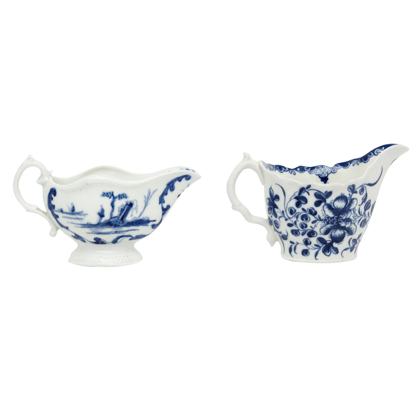 The first a 'Chelsea' shaped sauce boat with an ear-lobe handle decorated in under-glaze blue with a flower spray on each side and a scroll pattern on the interior of the rim, circa 1757 - 1759, together with a moulded cream-boat with a gadrooned edge and moulded handle with leaf thumb rest, painted in under-glaze blue with the 'One-Porter Landscape pattern, circa 1765.