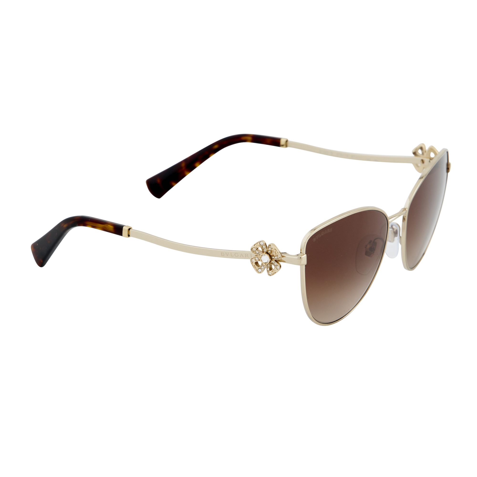 The cat eye frames styled in soft gold tone metal with gradient lenses, featuring crystal set flower accents to temples and tortoise composite temple tips.