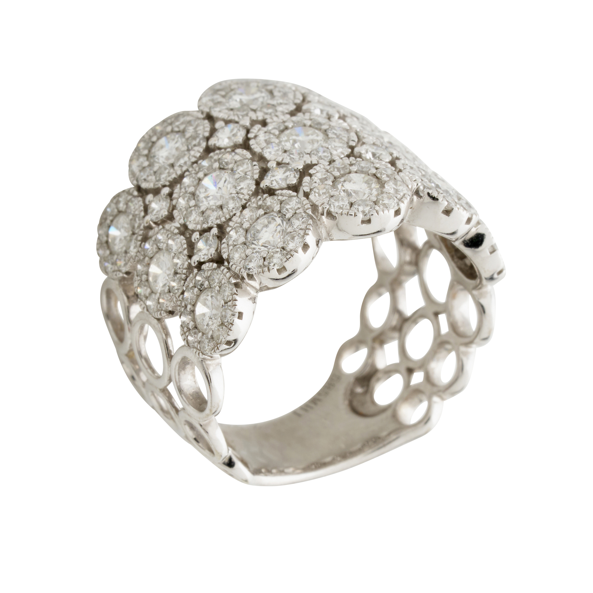 The wide pierced band, composed of brilliant-cut diamond clusters spaced by single claw-set diamonds, the diamonds together weighing approximately 2.97 carats, signed MHJ for Michael Hill Jewellers, size O, gross weight approximately 8.3 grams.