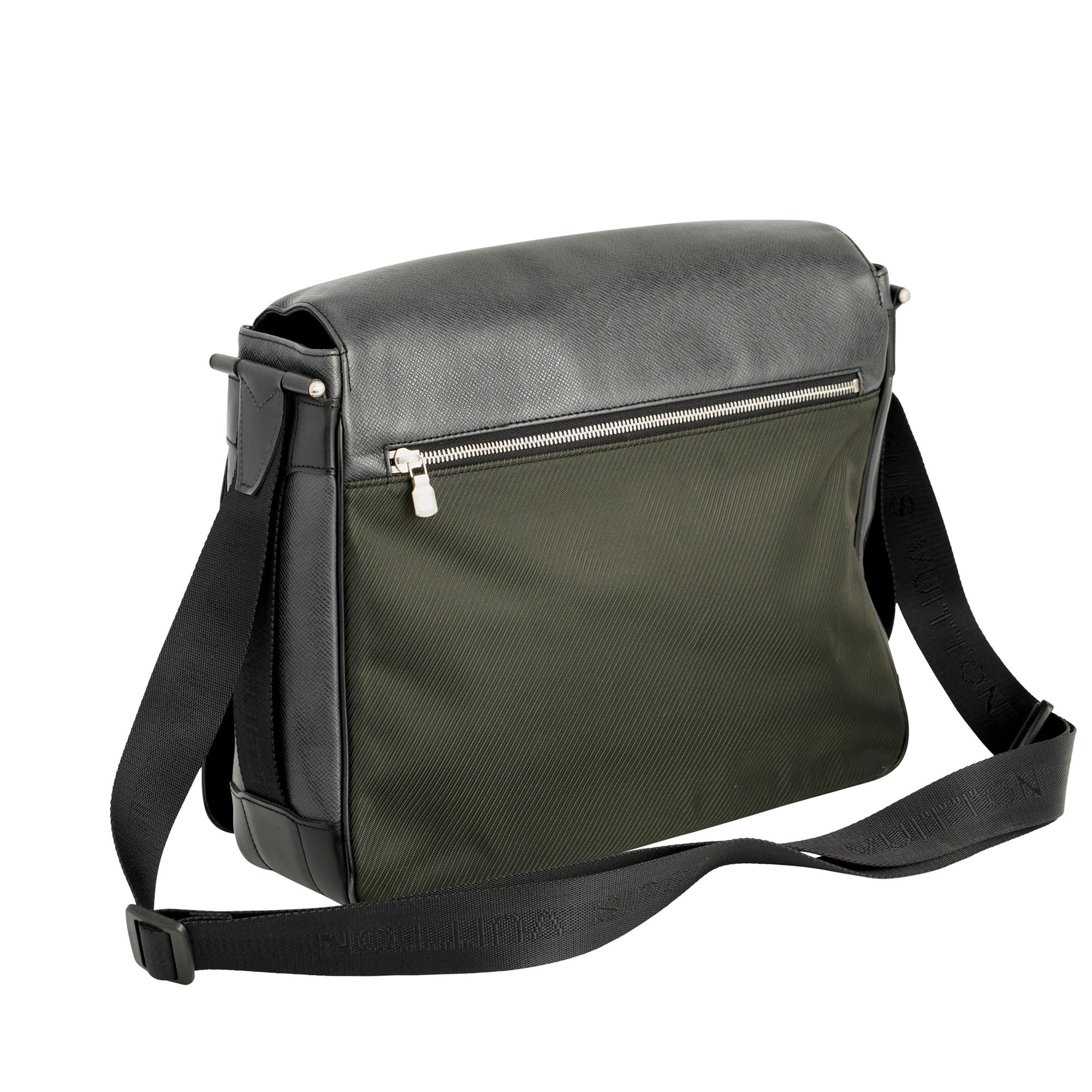 Styled in black Taiga leather with silver tone hardware, featuring dark moss canvas body and full flap closure, 28 x 35 x 11cm.
