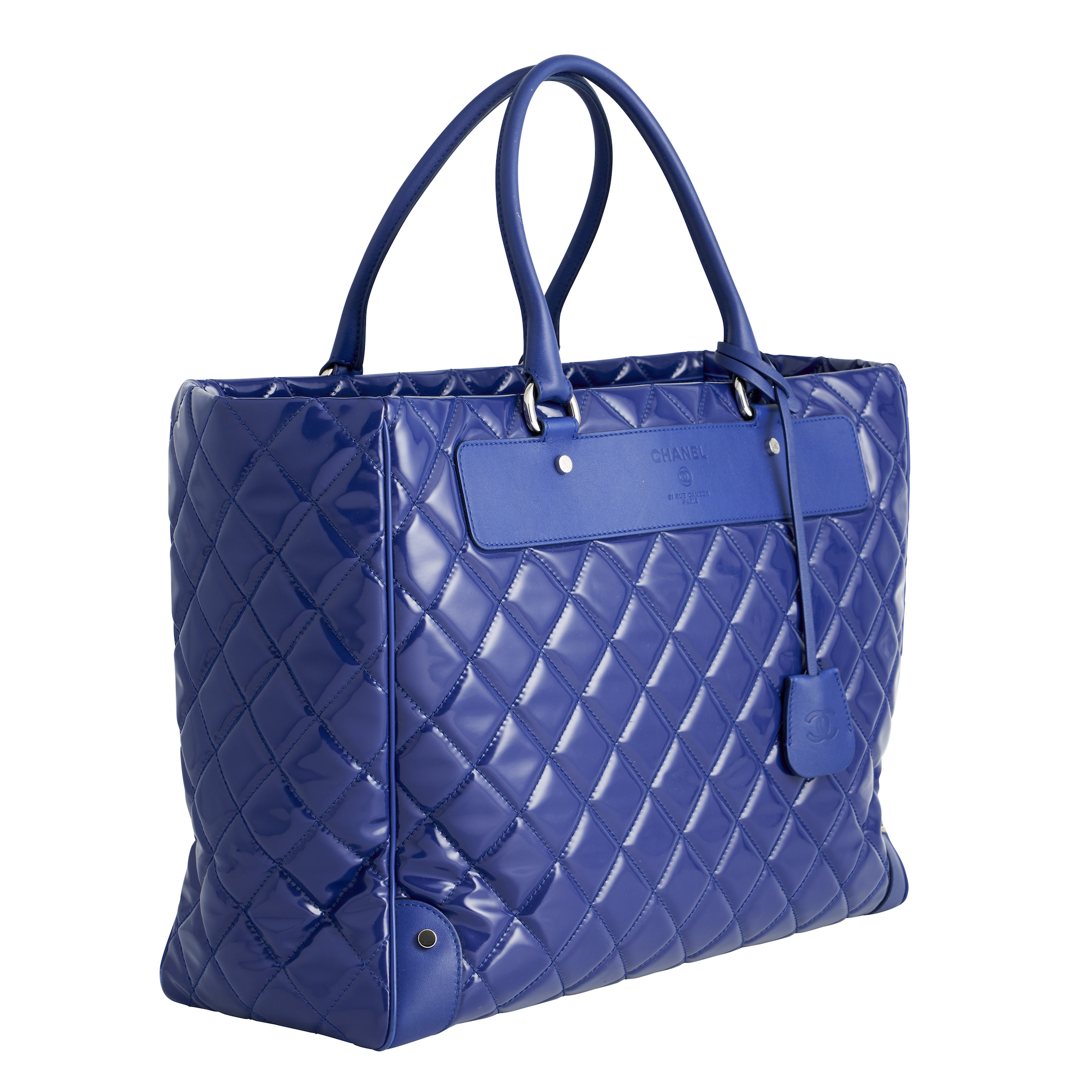 Styled in blue diamond quilted patent leather with tonal lambskin trim and silver tone hardware, featuring dual rolled top handles and full zip closure, 40 x 33 x 14cm.