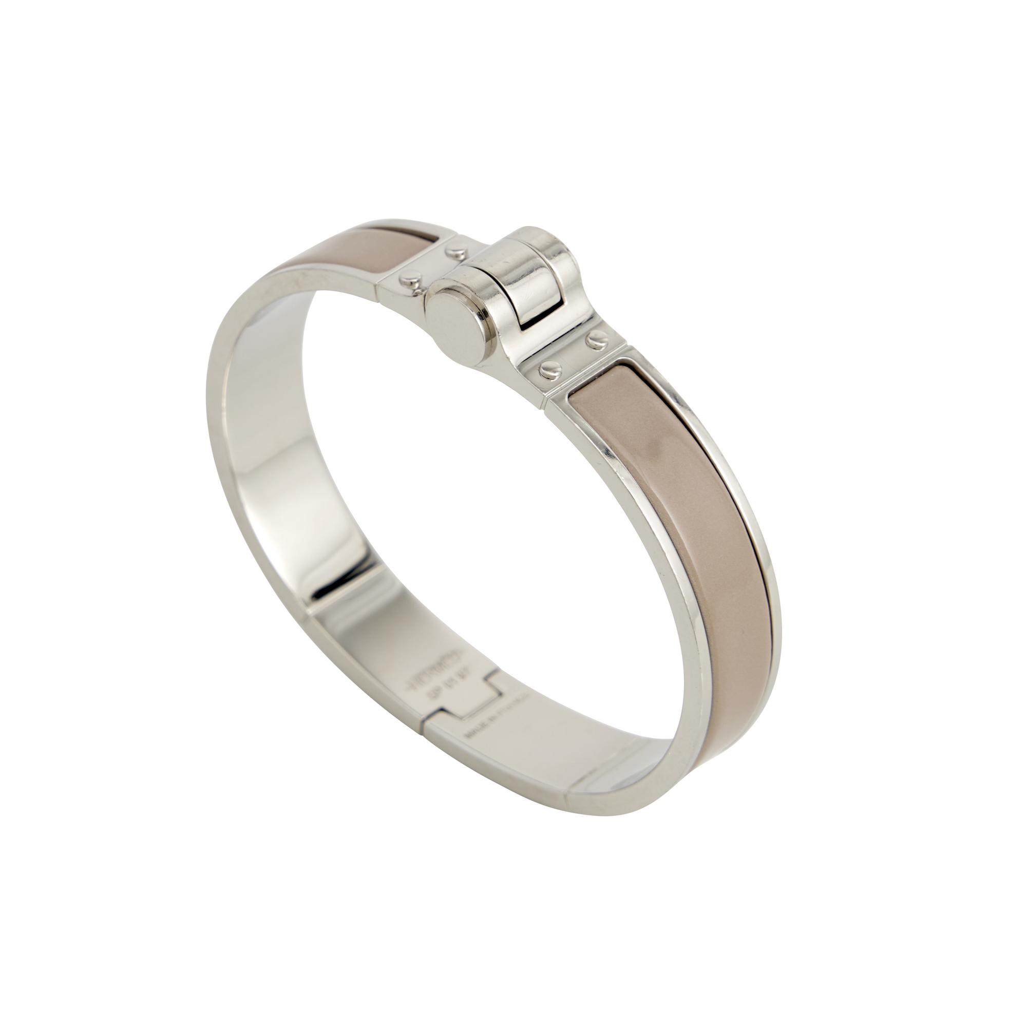 Styled featuring beige enamel in palladium plated hardware, 6.5 x 5cm.