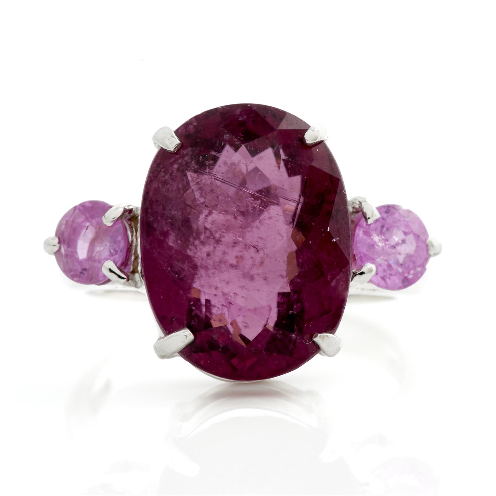 A RUBELLITE TOURMALINE AND PINK SAPPHIRE RING IN 18CT WHITE GOLD, THE TOURMALINE WEIGHING 8.40CTS, WITH SAPPHIRES TOTALLING 1.20CTS, SIZE N, ACCOMPANIED BY A VALUATION